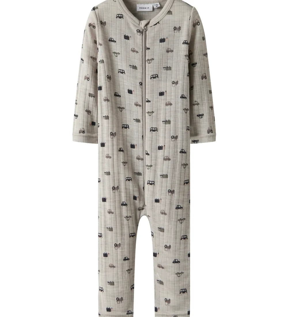 Charmerende Name It natdragt i en lys beige farve. Natdragten har et gennemgående print med små køretøjer i forskellige farver. Natdragten åbnes praktisk med en lynlås med hagebeskytter foran, der gør det nemt at klæde af og på. Natdragten er fremstillet af lækkert merinould.