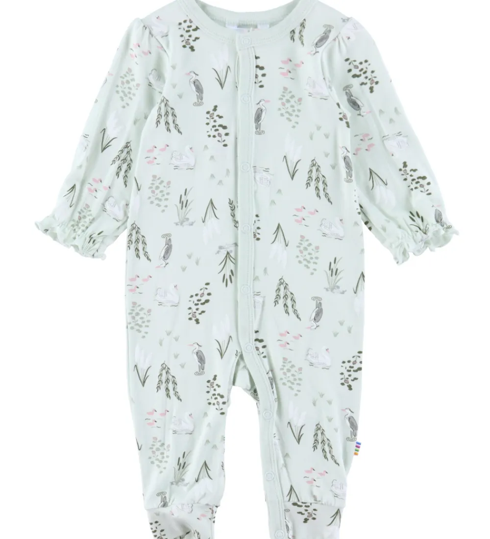 Skøn Joha natdragt i lys grøn med alloverprint af søde dyr og planter i hvid, rosa og grønne nuancer. Joha natdragten har en rund halsudskæring, og gennemgående knapper fra halsen til venstre fod, så det er muligt at åbne natdragten helt op. Natdragten har lange ærmer med flæseafslutning og lange ben.