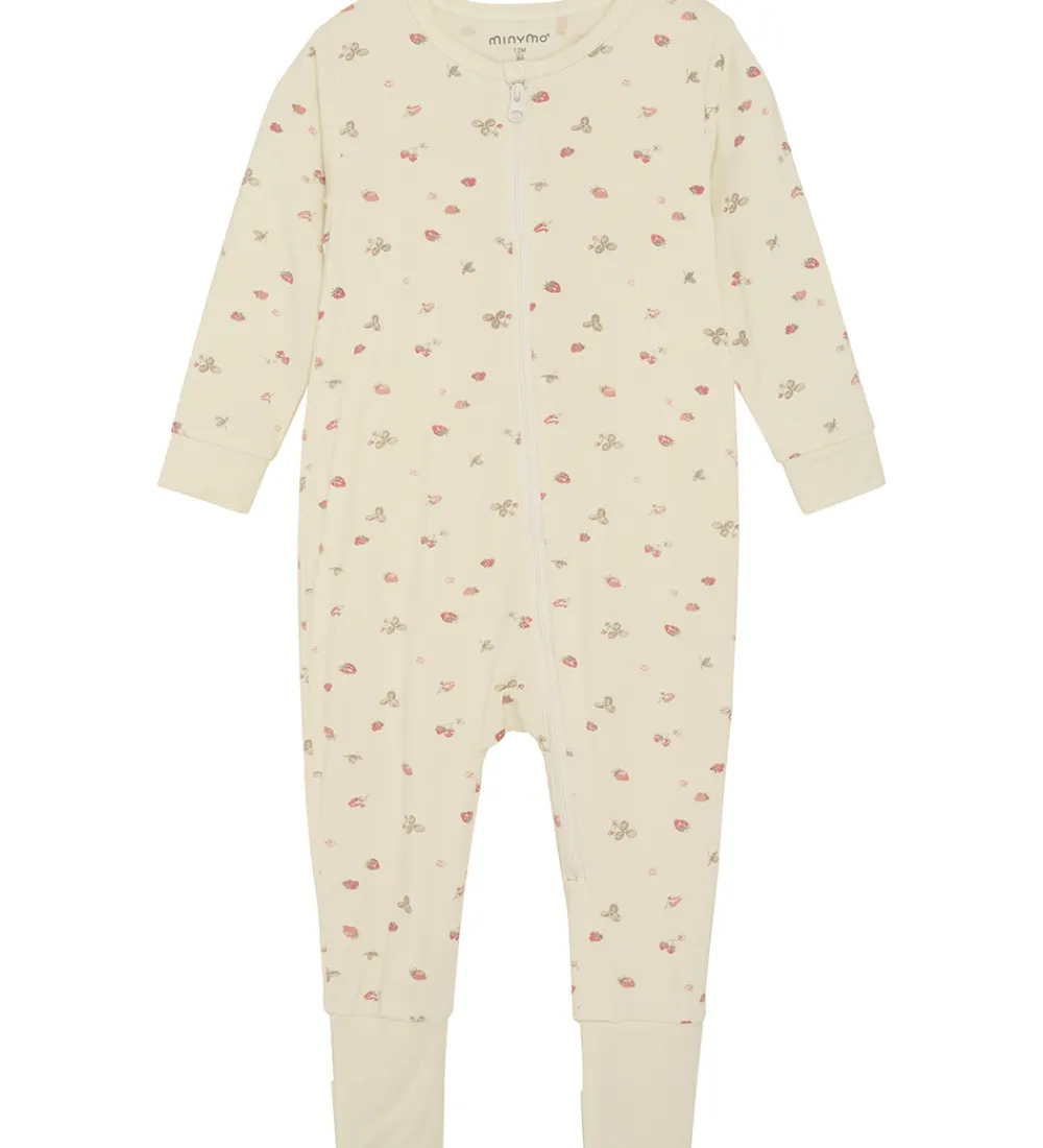 Skøn Minymo heldragt i cremehvid med et fint allover jordbærprint i rød og beige.