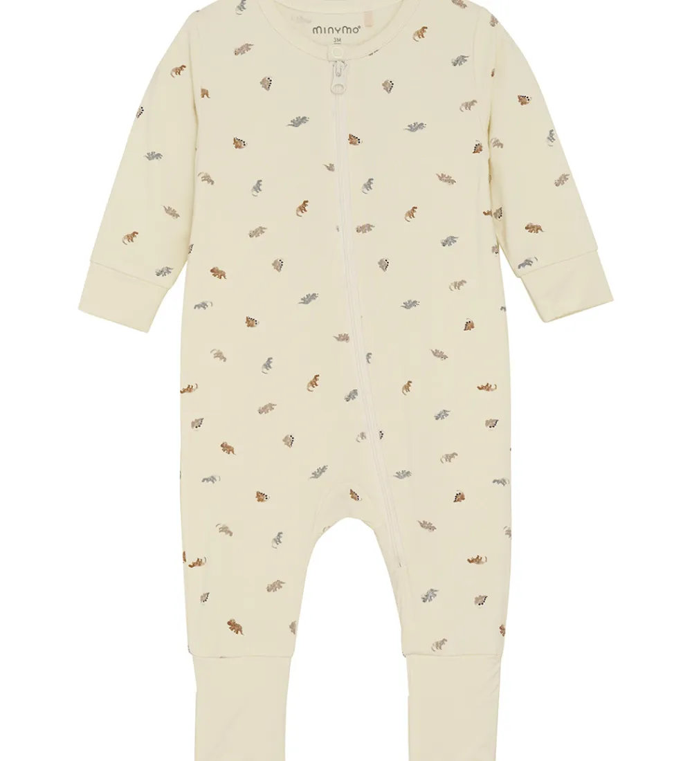 Skøn Minymo heldragt i cremehvid med et fint allover dinosaurerprint i grå, beige og brun.