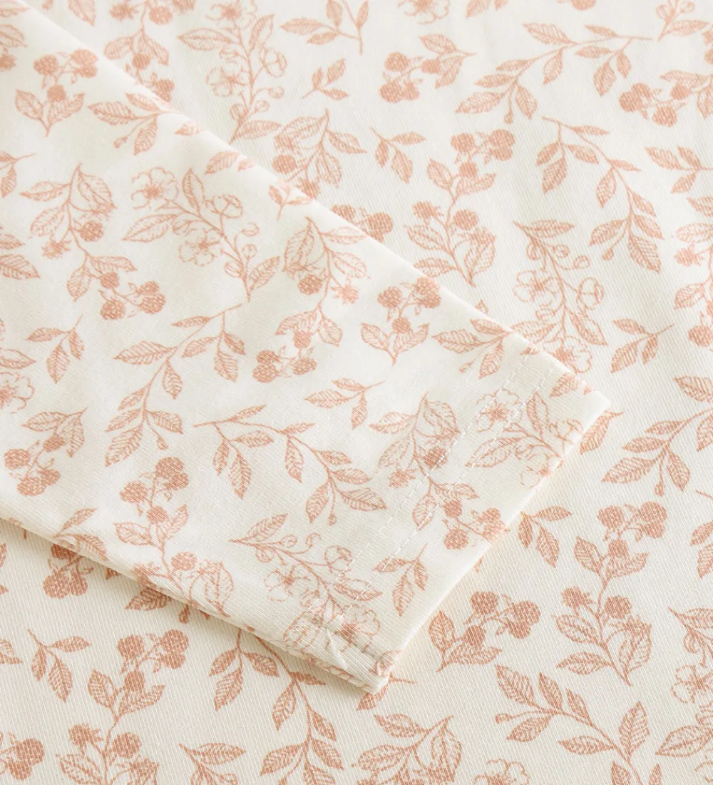 Elegant CeLaVi natkjole i hvid med et fint print af bær, blomster og blade i en rosa nuance. Natkjolen har en rund halsudskæring og lange ærmer med rynker ved skuldrene, som giver en flot effekt.
