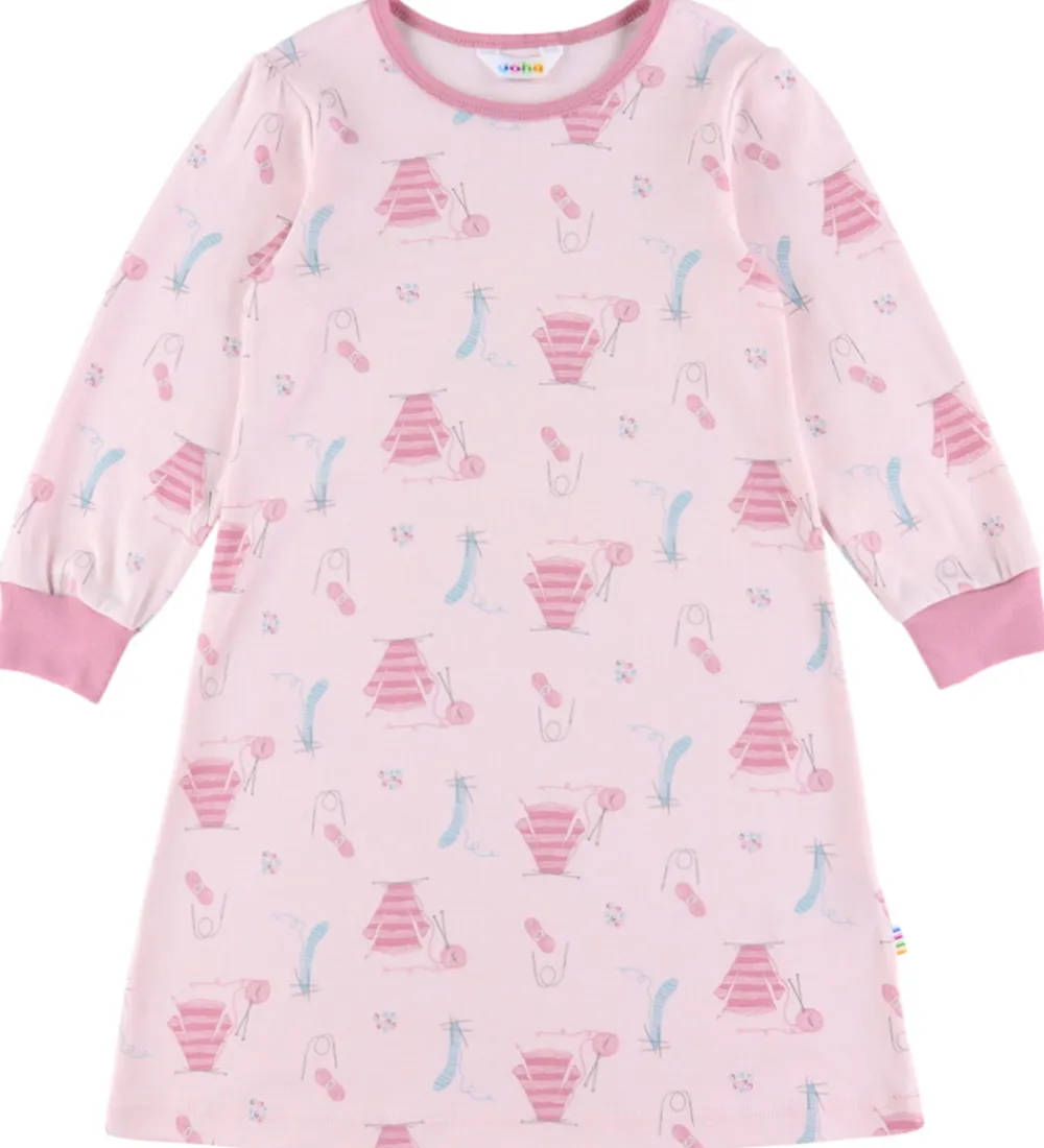 Fin Joha natkjole i lys rosa med print med strikketema. Natkjolen har en rund halsudskæring og lange ærmer med puf ved skuldrene. Den har kanter i mørkere rosa og brede ribkanter ved håndleddene.