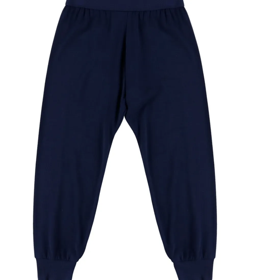 Skønt Joha nattøj bestående af en natbluse og et par natbukser. Natblusen er hvid med racerprint i blå nuancer. Den har en rund halsudskæring og lange ærmer med brede ribkanter. Natbukserne er ensfarvet navyblå med elastik i taljen og ribkanter ved anklerne. Nattøjet er fremstillet af blødt bambus viskose.