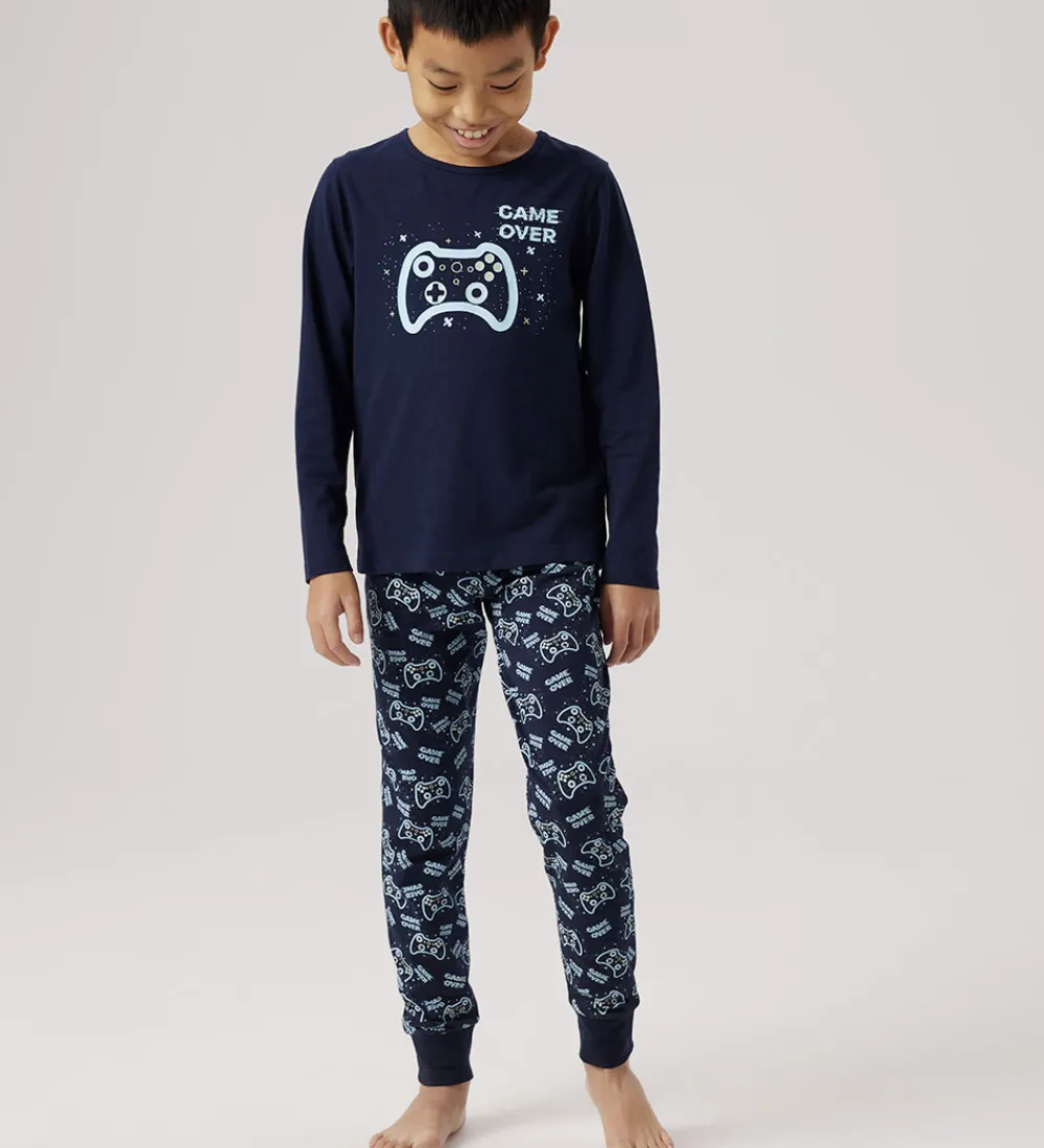 Skønt Name It nattøj, som er 2-delt med en natbluse i navyblå med et gaverprint på fronten samt et par natbukser i navyblå med et allover-gamerprint, der sikrer en god nat.