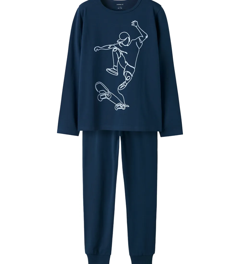 Komfortabelt Name It nattøj 2-delt i mørkeblå med lange ærmer og et sejt skateboard-print på forsiden. Name It nattøjet er designet til at give en behagelig og afslappet pasform.