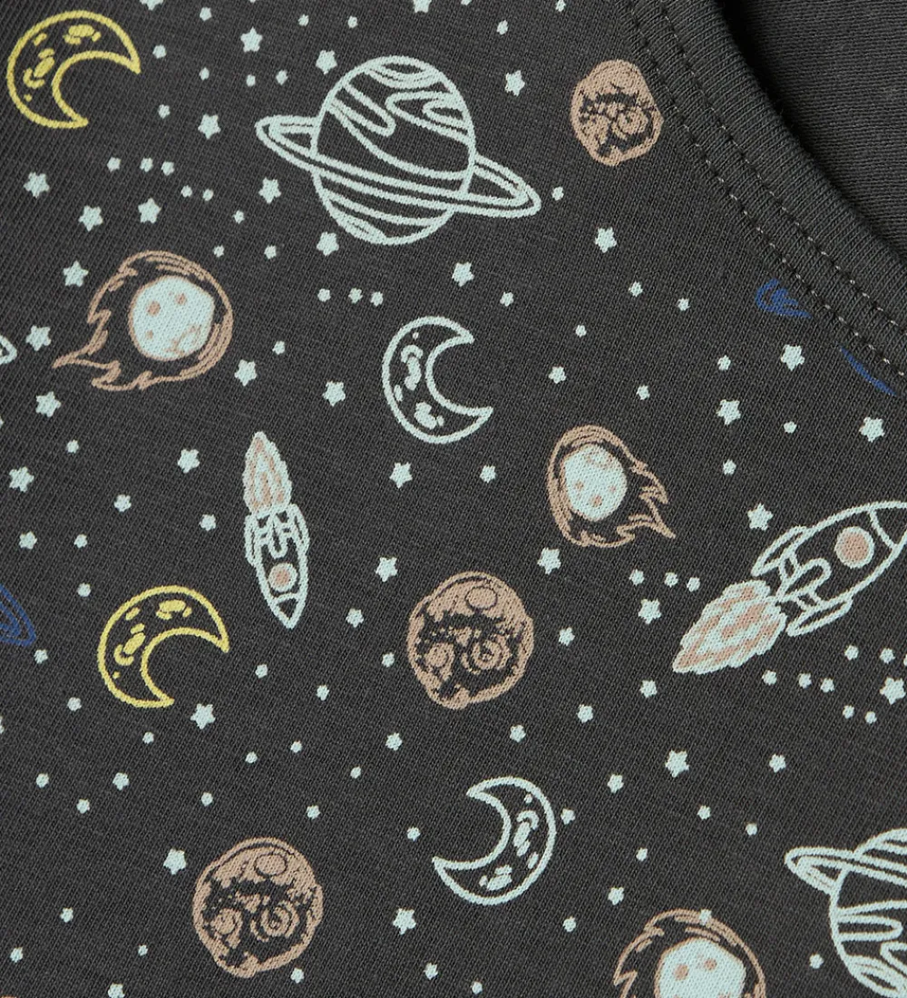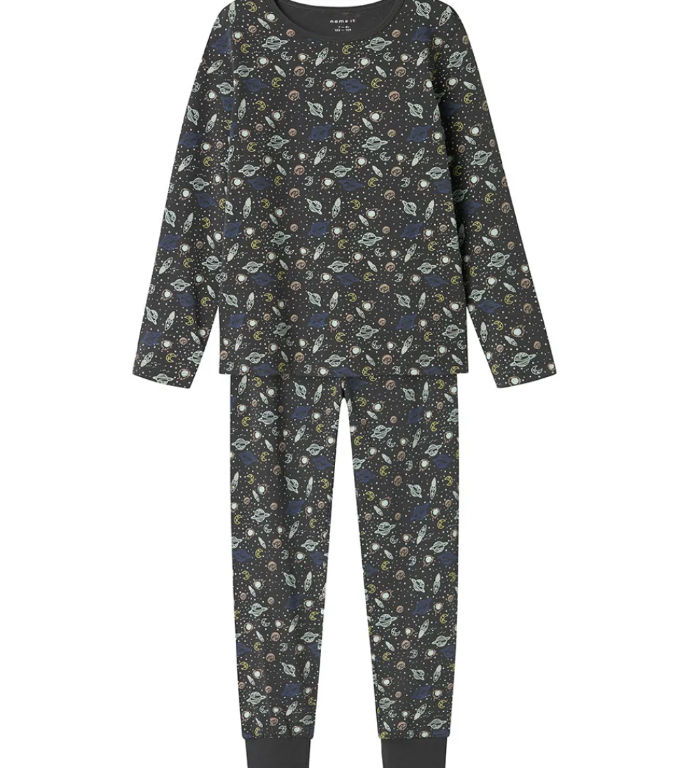 Skønt Name It nattøj, som er 2-delt med en natbluse og et par natbukser i mørkegrå med et allover-rumprint, der sikrer en god nat.