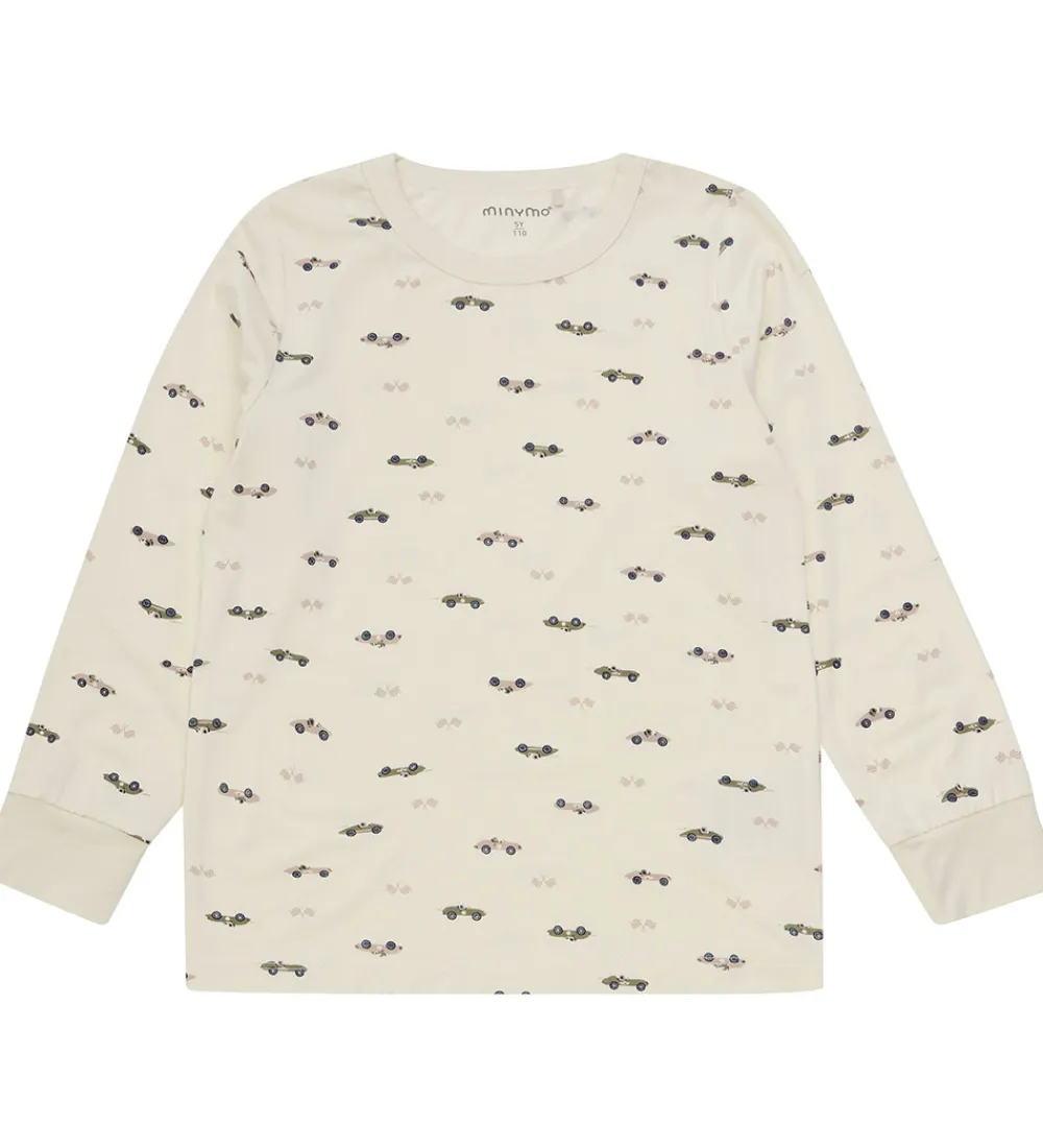 Minymo natblusen har lange ærmer og brede ribkanter. Natbukserne har lange ben med brede ribkanter, og i livet har de en bred elastikkant, som sikrer en god pasform. Nattøjet er lavet i en blød og lækker kvalitet.