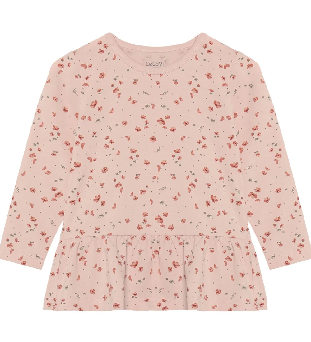 Fint CeLaVi nattøj i rosa bestående af en natbluse og et par natbukser. Natblusen har har blomsterprint og lange ærmer. Nederst er der en flæsedetalje. Natbukserne har elastik i taljen og en tætsiddende pasform.