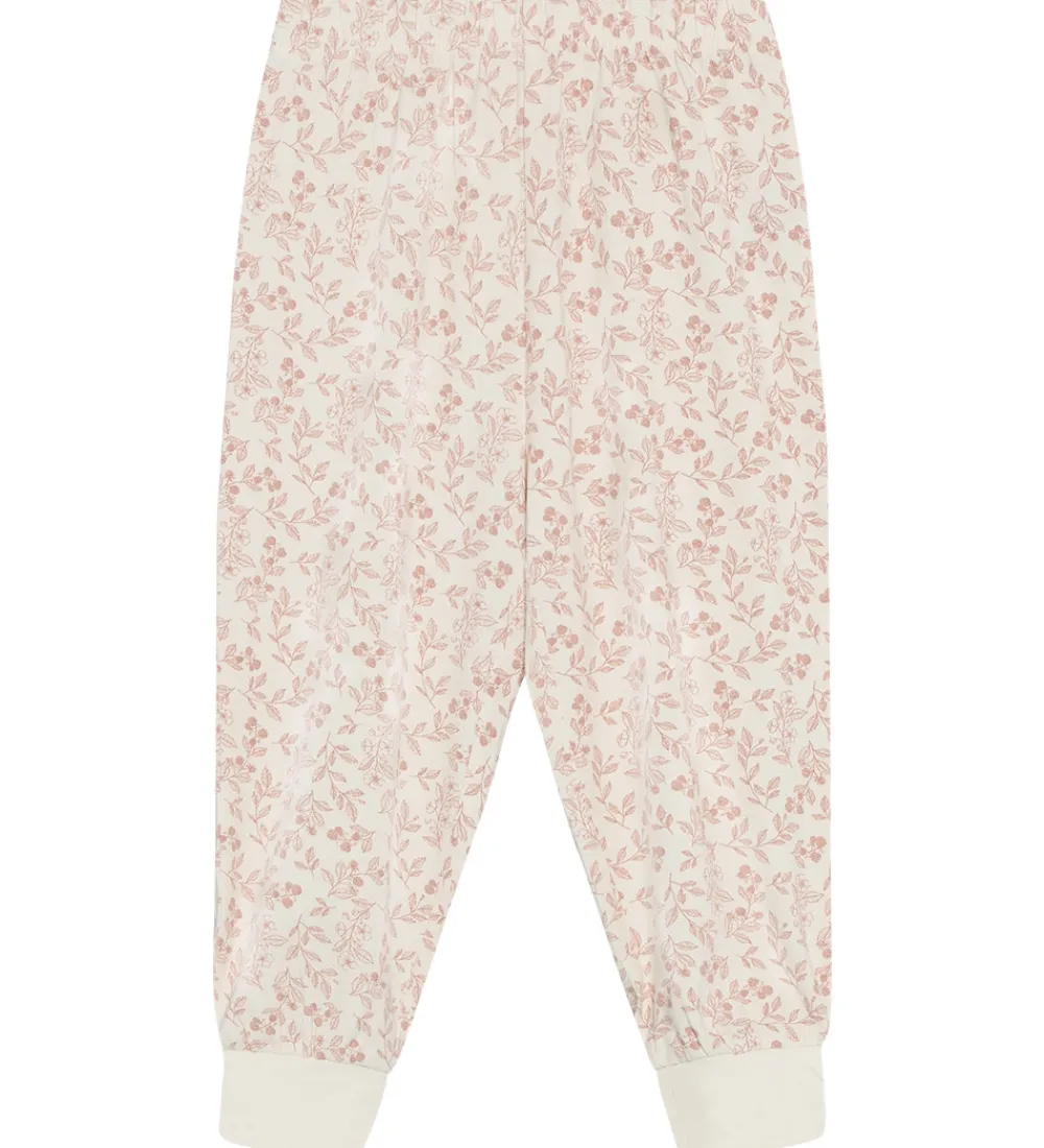 Sødt CeLaVi nattøj i hvid og rosa bestående af en natbluse og et par natbukser. Natblusen har et lille print af bær på brystet og lange ærmer med rynker ved skuldrene. Natbukserne har et alloverprint af bær, blomster og blade. I taljen er der en god elastik, og i benåbningerne er der brede ribkanter.