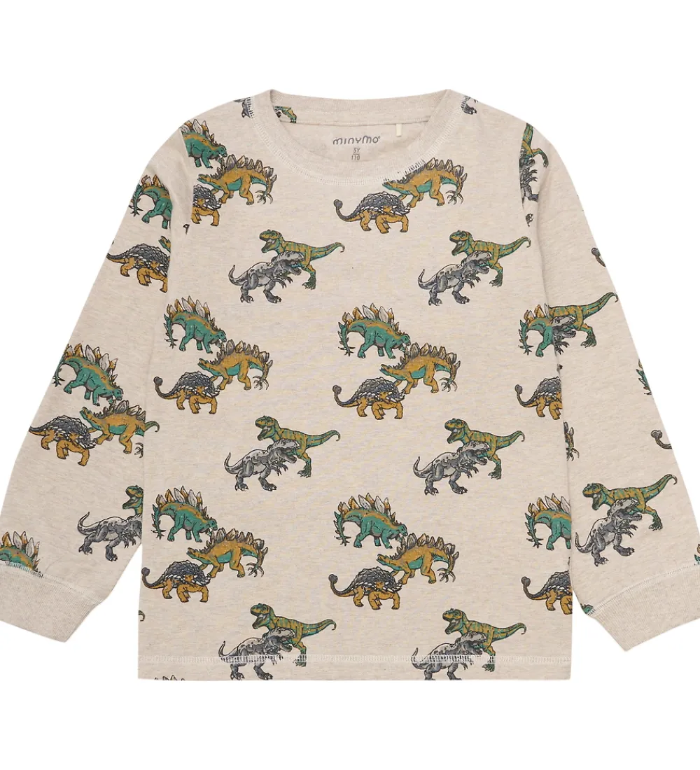 Dejligt 2-delt Minymo nattøj i en flot beige nuance. Sættet har et smart alloverprint af farverige dinosaurer på både bluse og bukser, der giver et sjovt og skønt look.