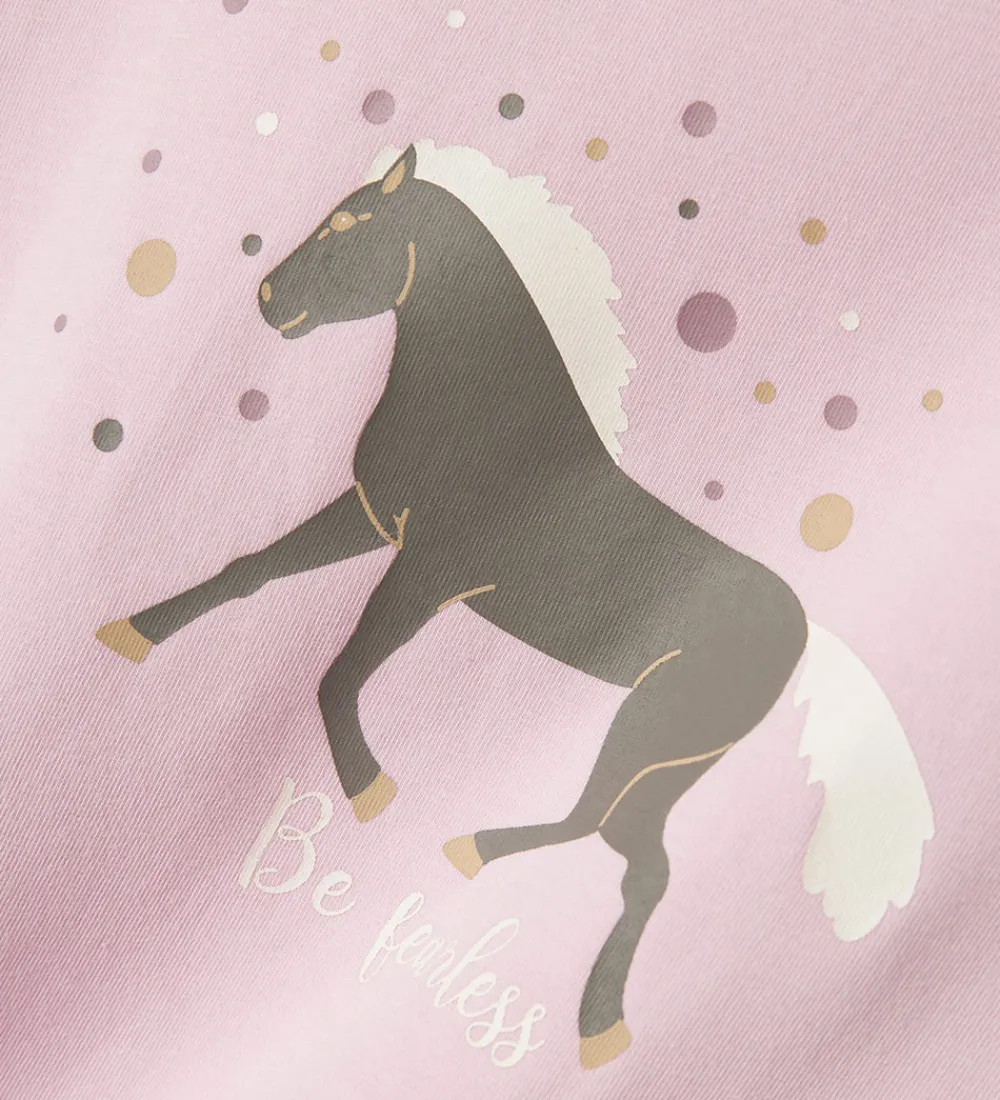 Lækkert Name It nattøj, som er 2-delt og i en lys rosa med et fint hesteprint på bukserne og et sødt hesteprint på blusen. Perfekt til en god nats søvn.