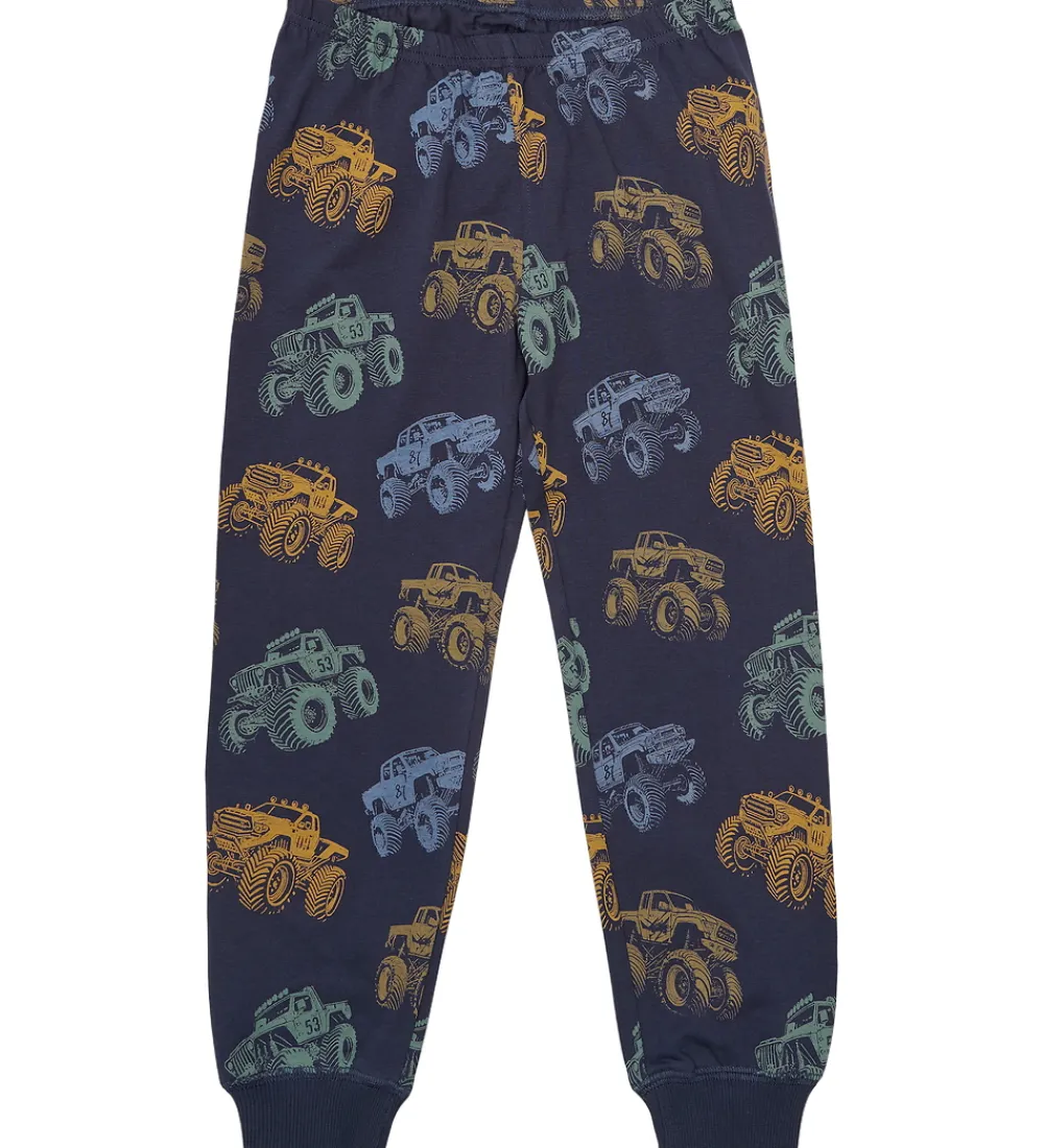 Flot Minymo nattøj 2-delt i en mørk blå nuance med et farverigt monstertruck-print. Minymo blusen har lange ærmer, der sammen med bukserne giver en behagelig pasform.