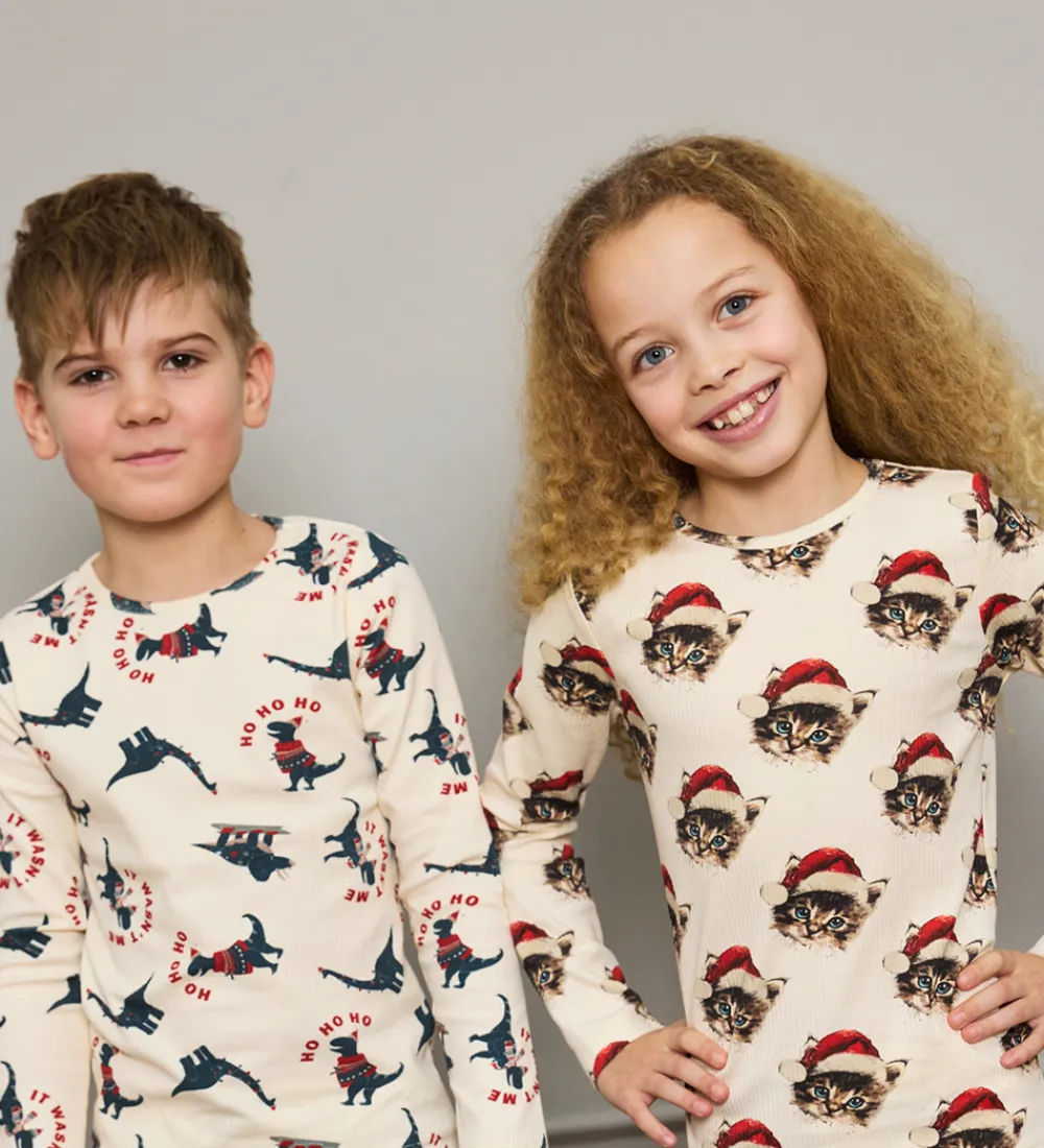 Dejligt nattøj fra The New bestående af en natbluse og et par natbukser i cremehvid og er prydet med et livligt dino-print i grønne og røde bogstaver, der skaber et sjovt udtryk. Natblusen har lange ærmer mens natbukserne har en elastisk talje, der sikrer en god pasform.