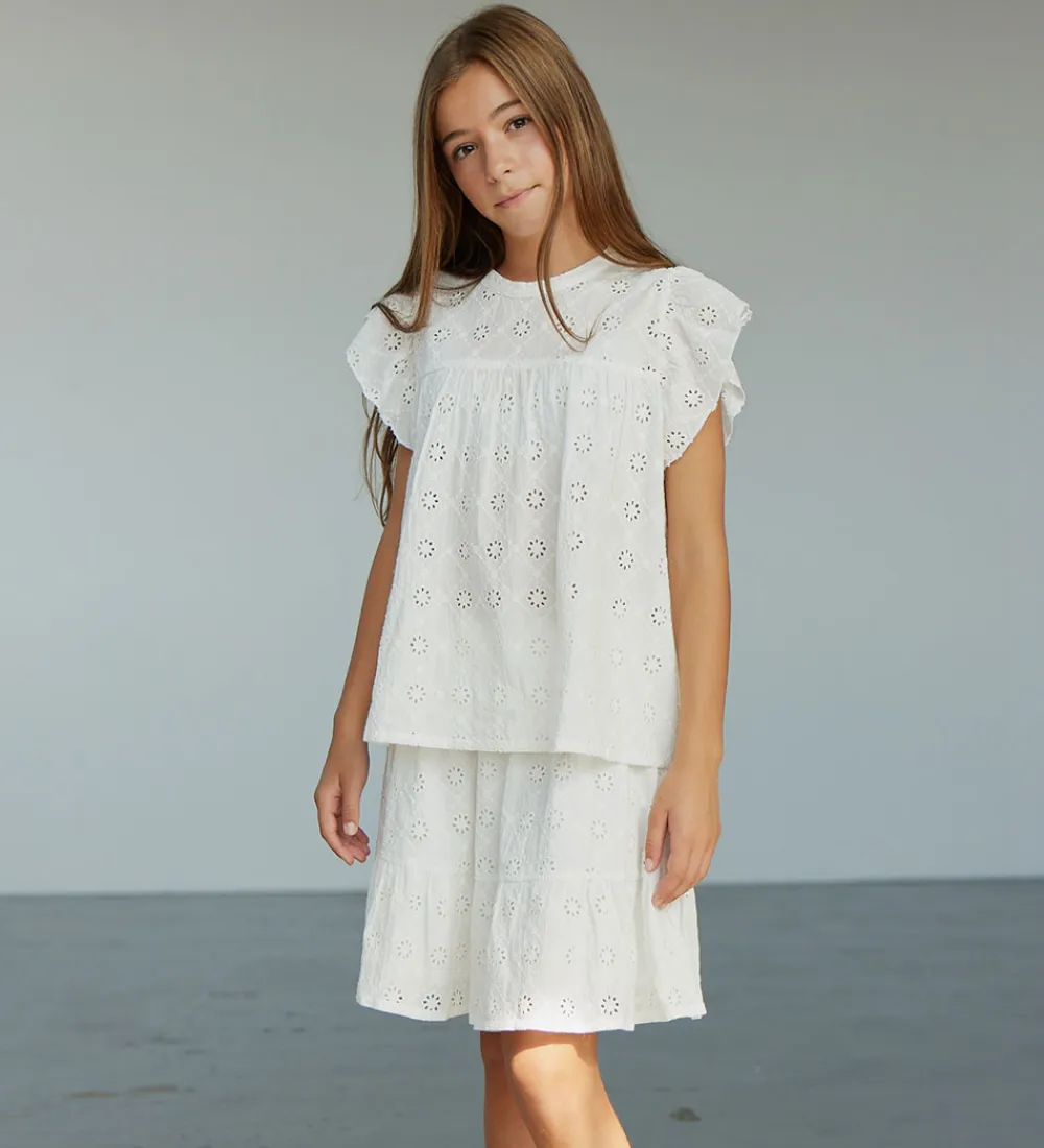Yndig Sofie Schnoor nederdel i råhvid med et smukt broderi anglaise hulmønster over det hele