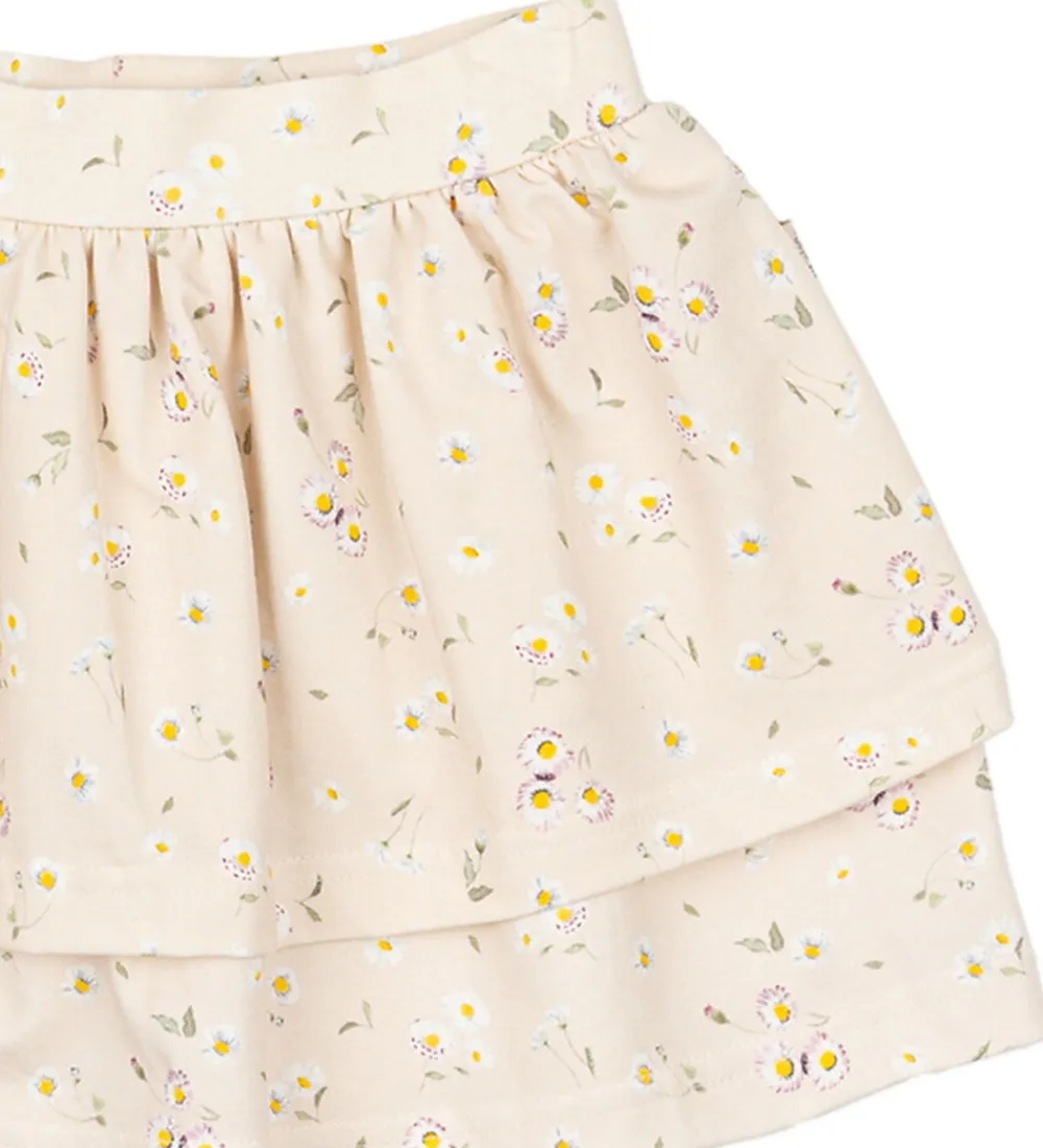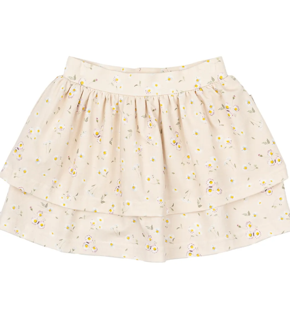 Charmerende Petit Piao nederdel i en lys, cremefarvet nuance med et delikat blomsterprint i hvide, lilla og grønne nuancer.