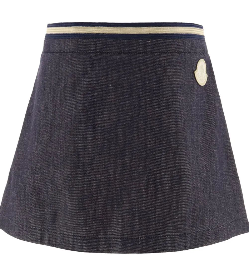 Flot Moncler nederdel i mørkeblå denim i en fastvævet kvalitet, og i livet er der en guldfarvet stribe med navy kanter.