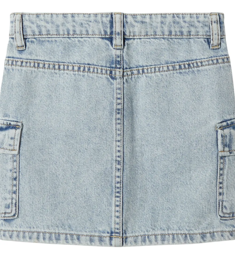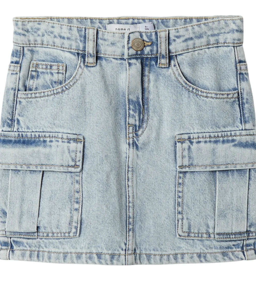 Flot Name It nederdel i lyseblå denim. Nederdelen har en elastisk talje, som kan justeres med knapper indvendigt. Den lukkes fortil med en hægte og lynlås, og i livet er der bæltestropper. Nederdelen har to lommer i toppen og to rummelig klaplommer nederst.