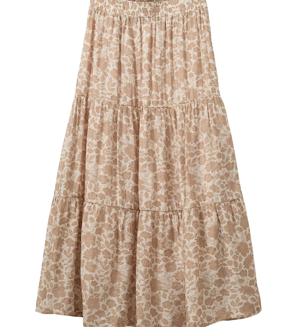 Lækker Sofie Schnoor nederdel i en lys beige med et fint blomsterprint i lysebrun.