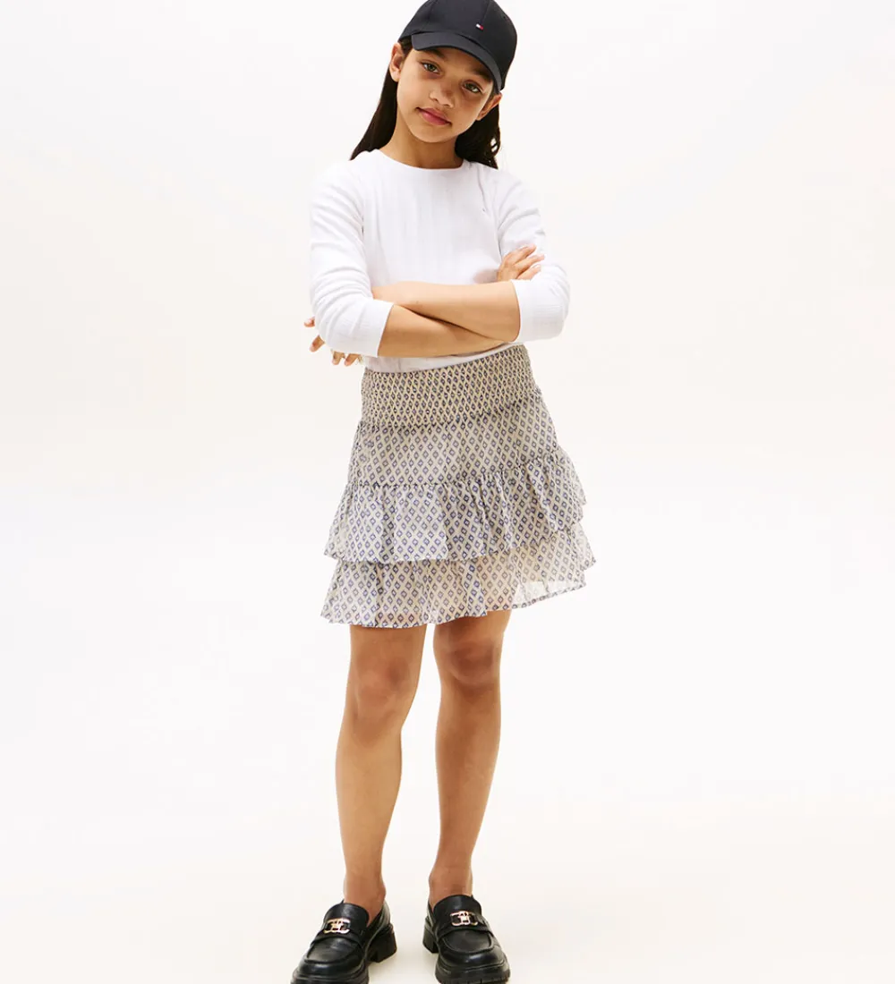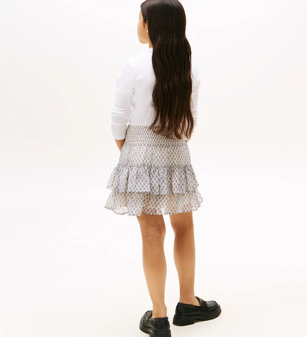 Flot Tommy Hilfiger nederdel i beige med et fint, blåt print. Nederdelen har flere lag og en elastisk smocktalje, som sikrer en god pasform.