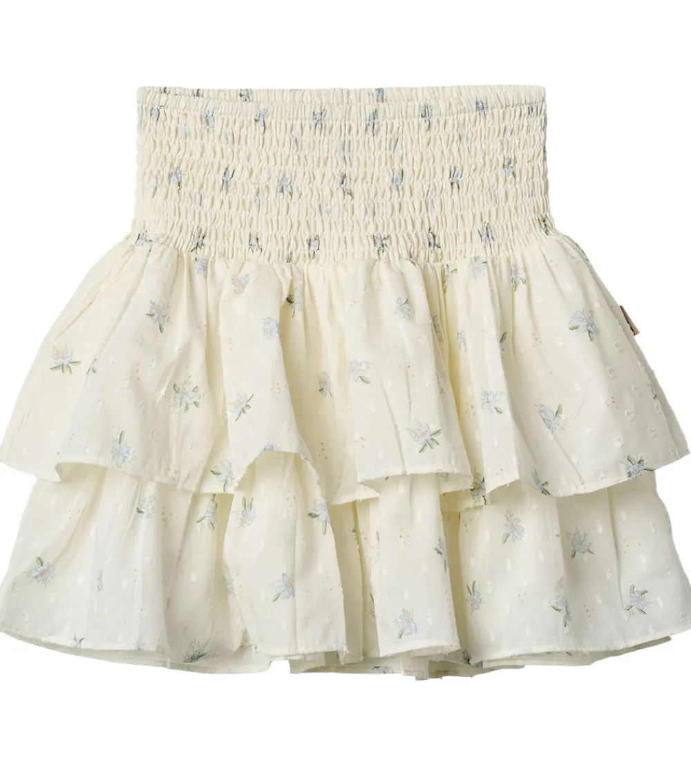 Charmerende Wheat nederdel i hvid med et fint blomsterprint. Nederdelen har en bred, elastisk talje for komfort og en let, flæset struktur, der giver et elegant udtryk. Perfekt til Wheat’s stilfulde garderobe.