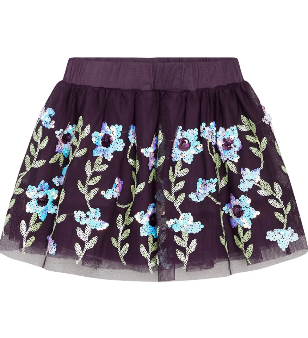 Smuk Hust and Claire nederdel i mørklilla tyl med blomstermotiver, dannet af palietter i grønne, blå og lilla nuancer.
