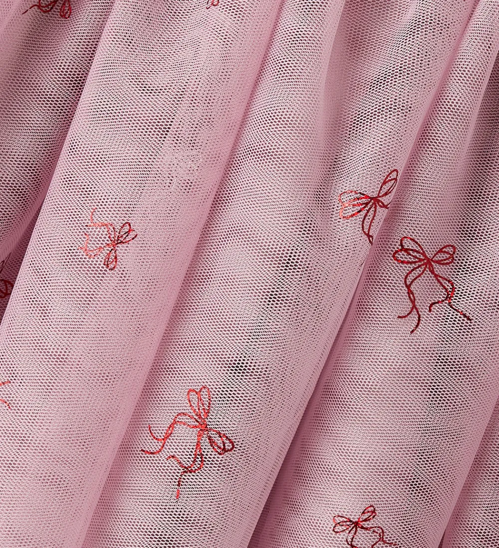Sød Name It nederdel i rosa med print af små sløjfer i rød glimmer. Nederdelen har en elastik i taljen med rosa glimmer. Den består af et lag genanvendt polyester inderst og flere lag tyl yderst.