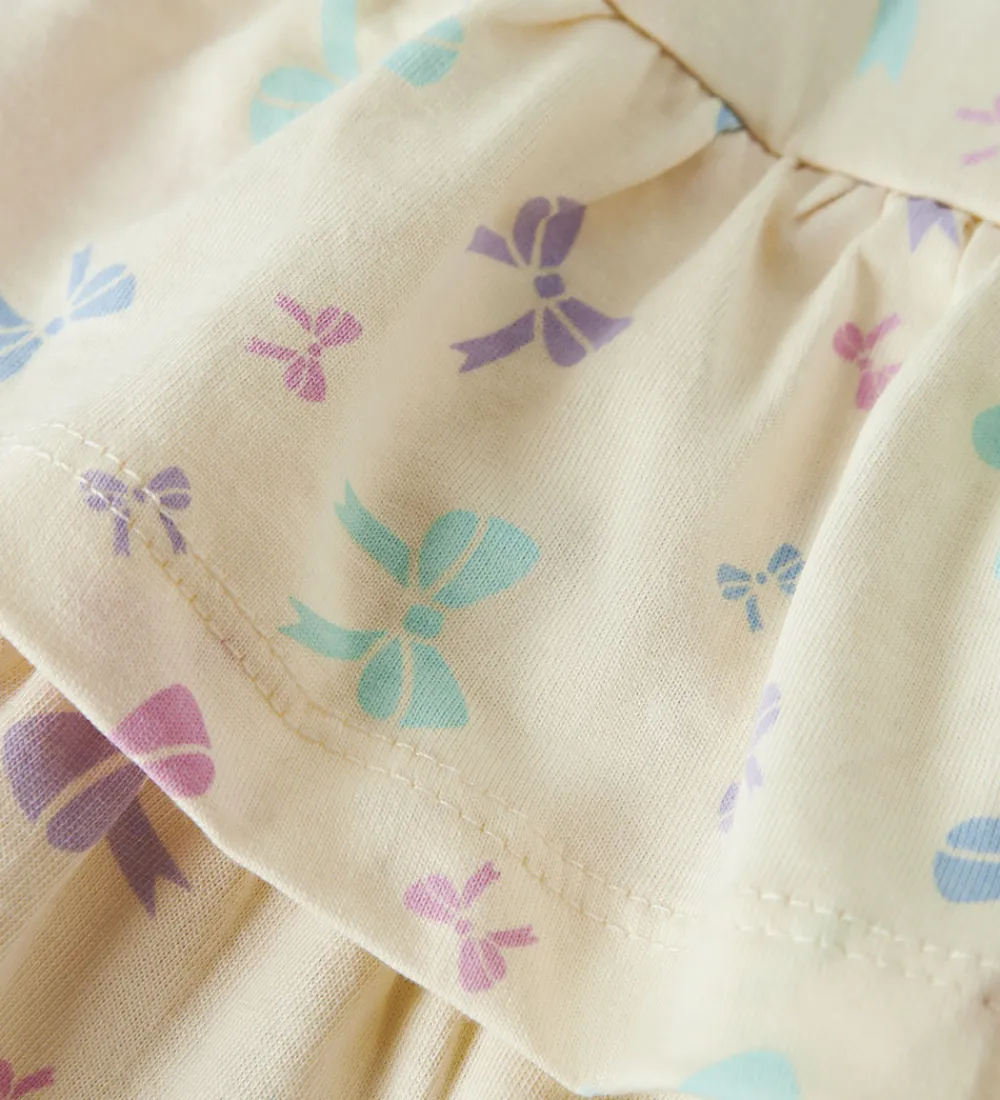 Charmerende Name It nederdel med smukt alloverprint af sløjfer i pastelfarver af rosa, grøn, blå og lilla.
