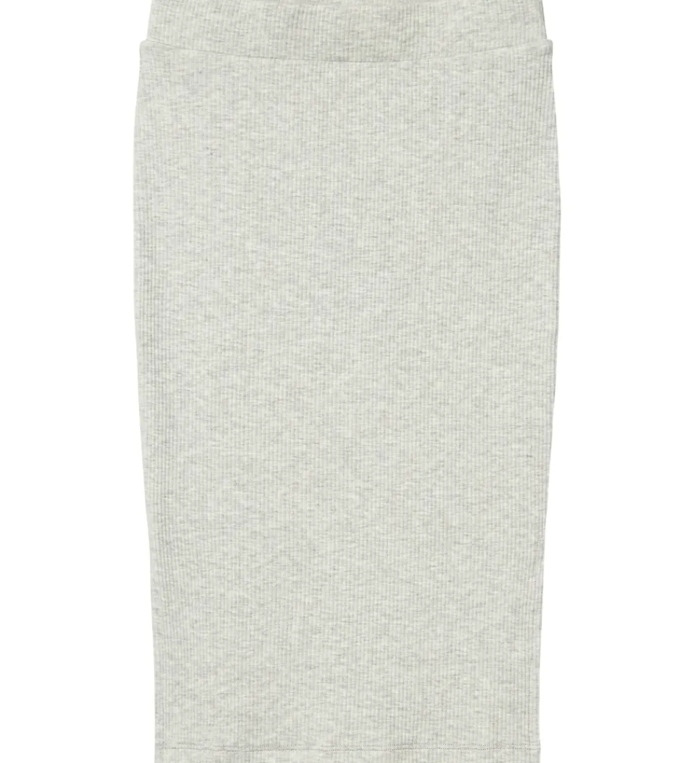Flot Name It nederdel i meleret lysegrå med ribstruktur. Nederdelen er en mellemlang model med tætsiddende pasform. Den har en bred elastik i taljen, og en slids nederst i begge side.