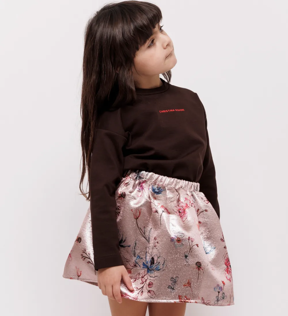 Smuk Christina Rohde nederdel i en skinnende rosa nuance med et flot, blomsterprint i flere farver, der tilføjer et elegant touch.