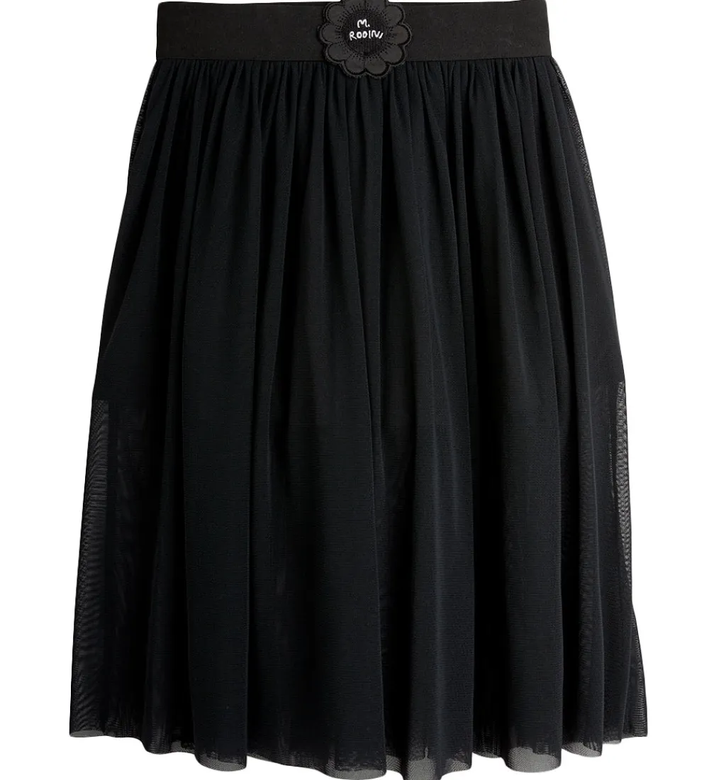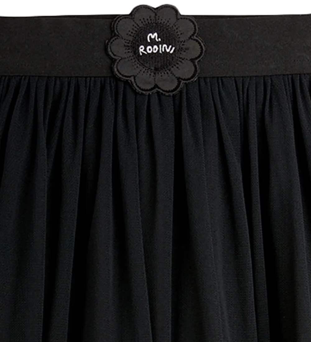 Elegant Mini Rodini nederdel i sort med en flot vidde og et dekorativt elastikbånd i taljen prydet med en fin blomstret detalje foran.