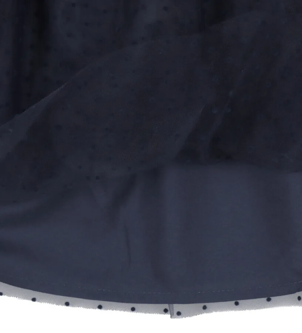 Elegant Fliink nederdel i mørkeblå med et gennemsigtigt lag prikket tyl. Fliink nederdelen har en elastisk talje. Passer perfekt til forskellige anledninger.