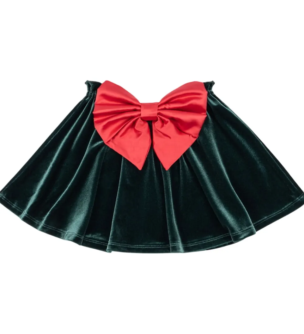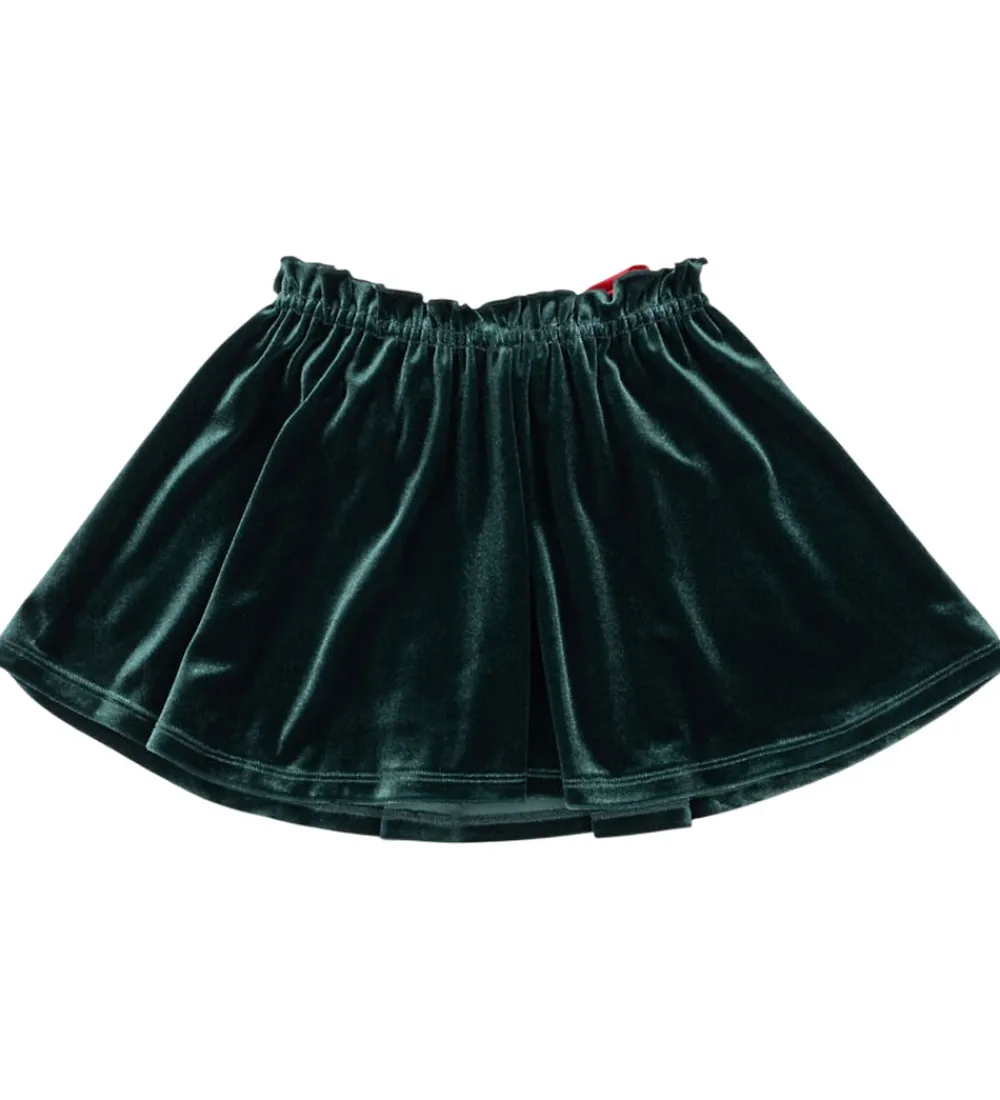 Flot nederdel fra Konges Sløjd i dyb mørkegrøn velour, og fortil sidder der en stor, koralfarvet sløjfe af satin. Konges Sløjd nederdelen har en smal elastikkant i livet, og nederdelen har masser af vidde.
