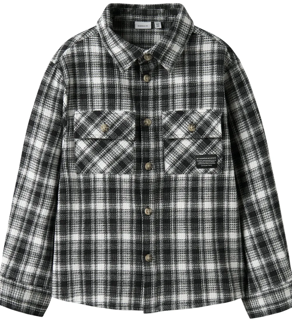 Stilren Name It overshirt med lange ærmer og et klassisk, ternet mønster i sort og hvid.