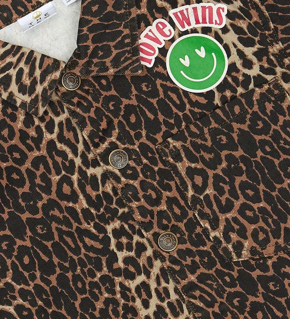 Cool overshirt fra The New i twilldenim og med et allover leopardmønster i varme nuancer. Overshirten fra The New har et flot print over den åbne brystlomme med en smiley og ordene “love wins”. Samme print er i et større format på ryggen. Overshirten har en gennemgående lukning fortil med trykknapper, og ærmerne afsluttes med slids og lukning med trykknap.