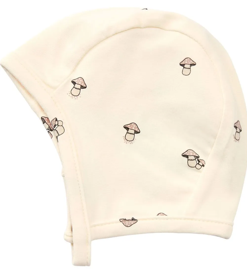 Sød Petit by Sofie Schnoor babyhjelm i cremehvid med et print af svampe i brune og røde nuancer.