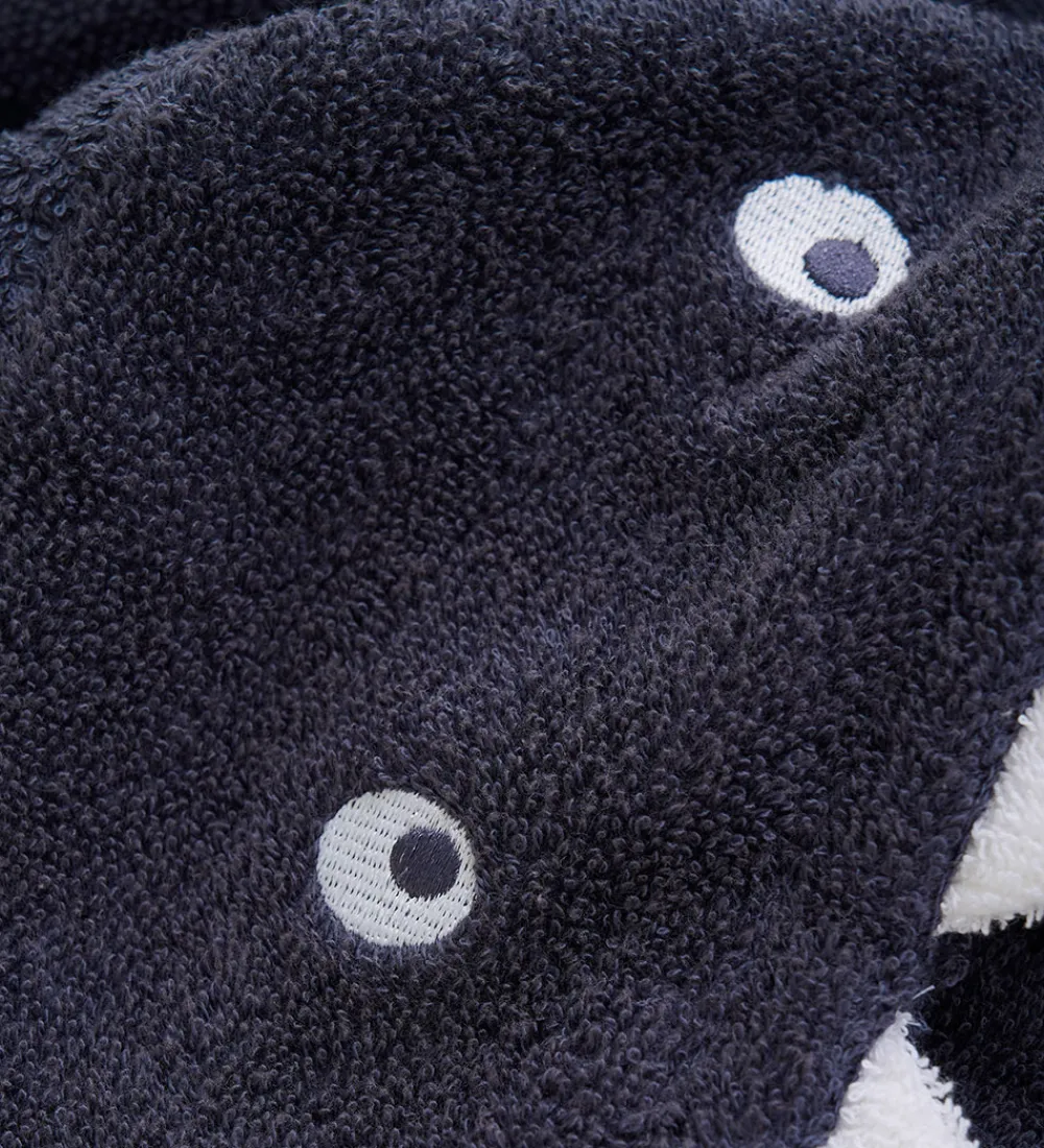 Fin Pippi badekåbe i mørkeblå med en fastsyet hætte udformet som en haj med store tænder.