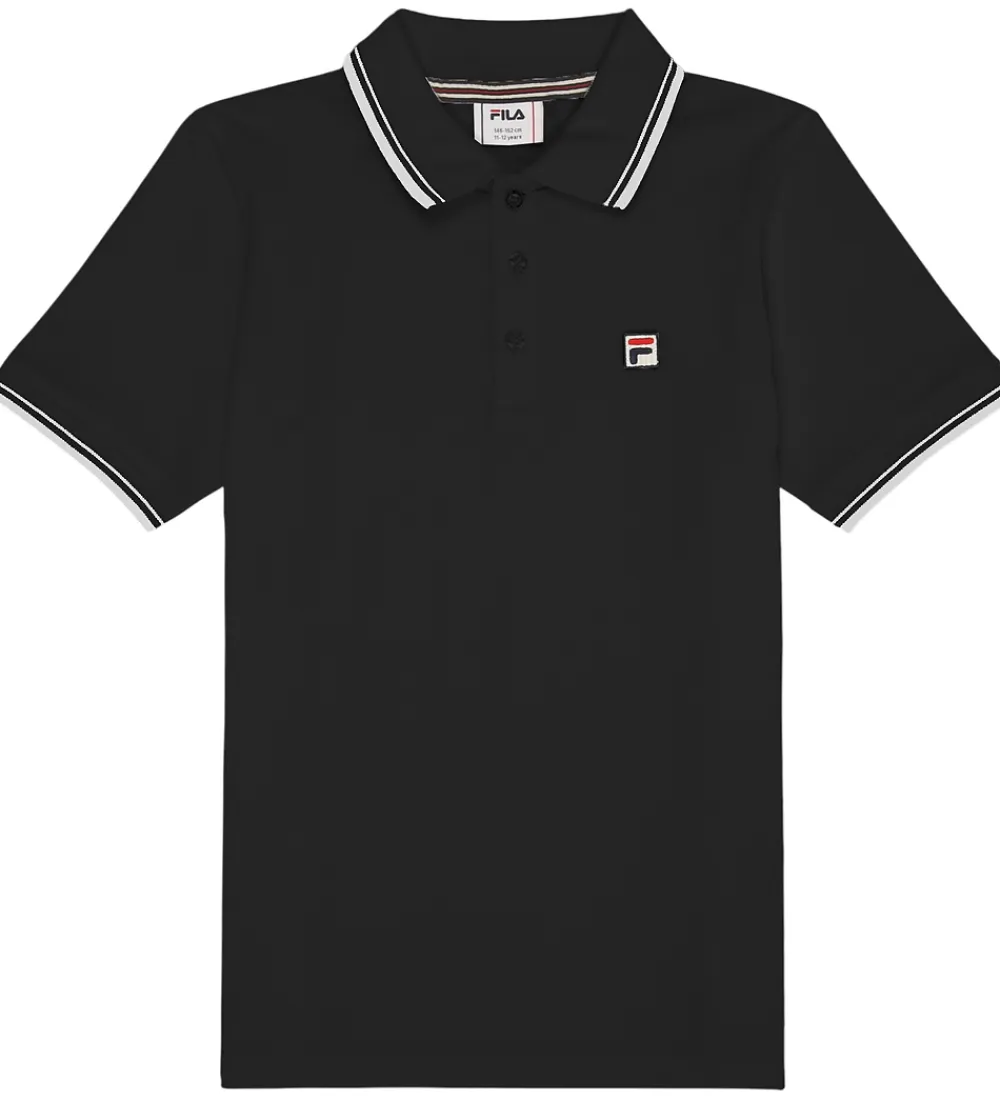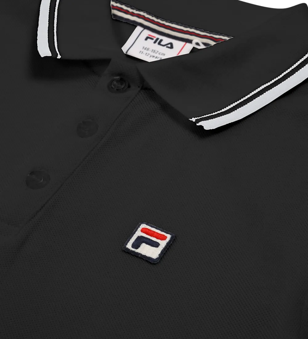 Stilren Fila polo med korte ærmer i klassisk sort. Poloen har en piqué-struktur og er dekoreret med smalle, hvide striber på kraven og ærmerne. Fila-logoet er placeret diskret på brystet, hvilket tilføjer et elegant touch til det samlede look.