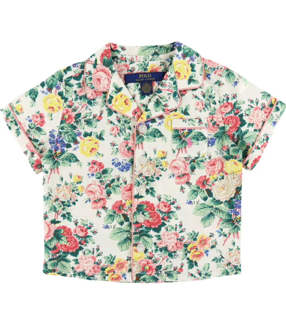 Sødt Polo Ralph Lauren nattøj, der består af et par natbukser og en natbluse i hvid med et blomstret mønster i rosa, lilla, gul og hvid og med blade i grønne nuancer. Nattøjet har rosa pipings, og det er lavet i en fastvævet kvalitet.