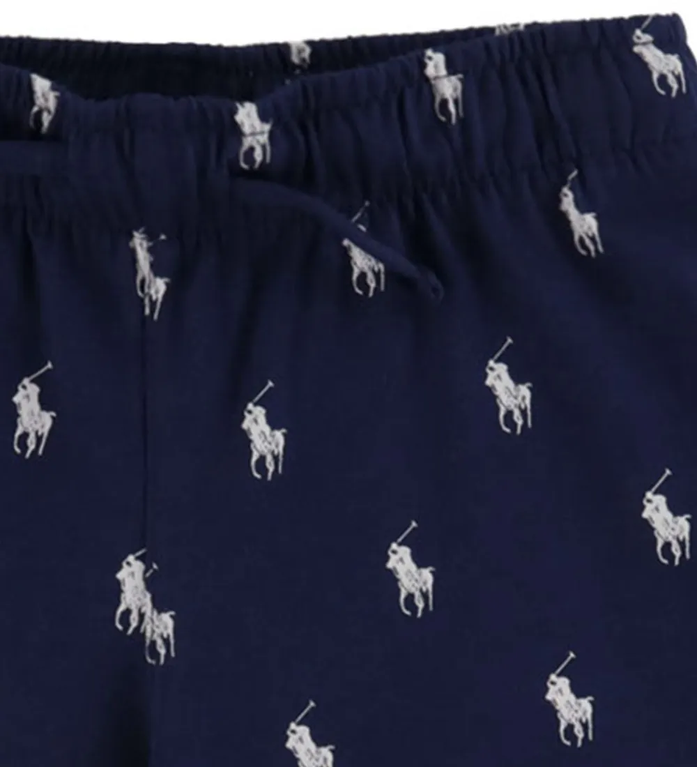 Lækkert Polo Ralph Lauren nattøj, der består af et par natbukser og en natbluse i navy bomuldsjersey, og på natbukserne er der trykt små, hvide logoer.