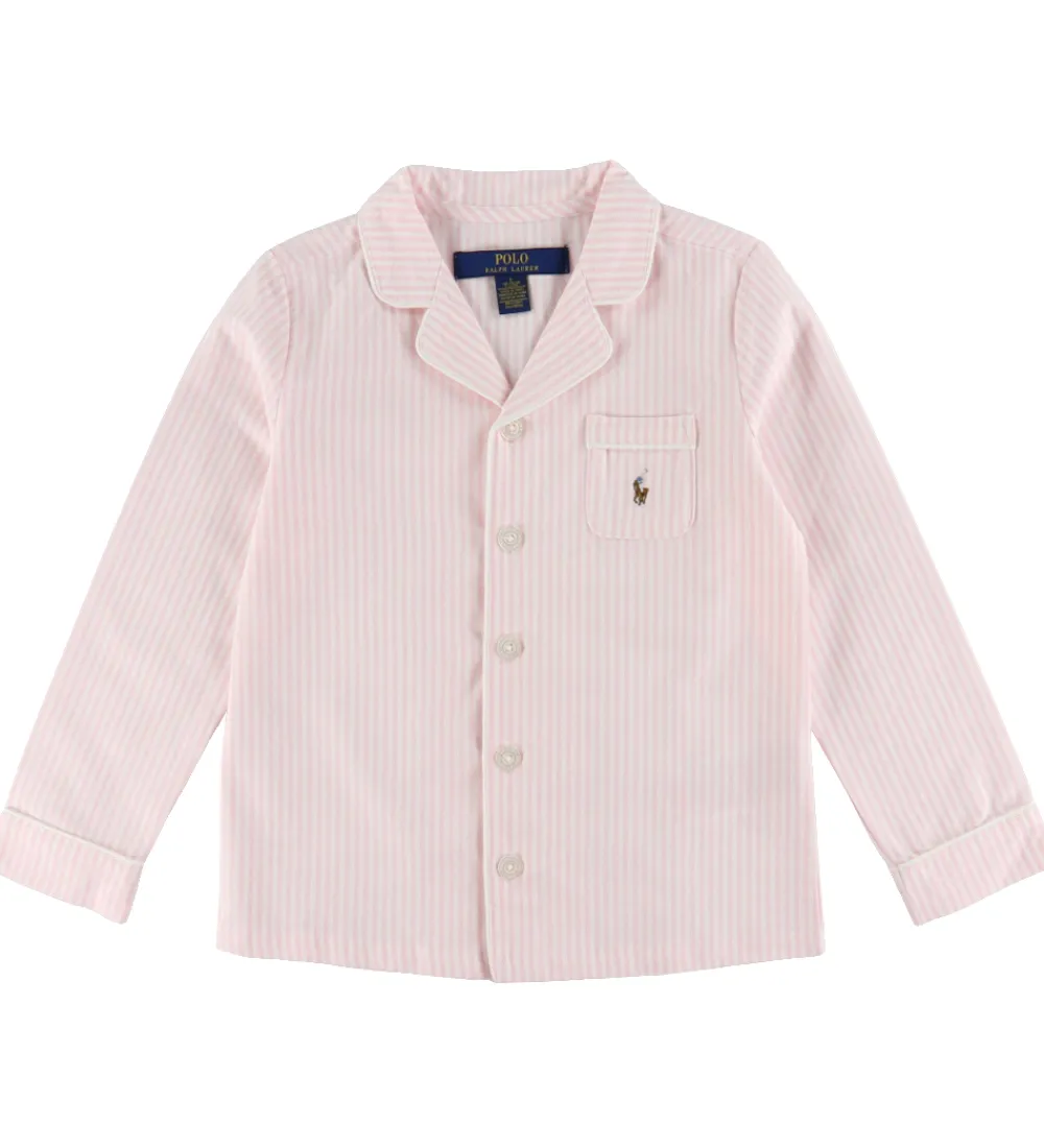 Sødt Polo Ralph Lauren nattøj, der består af et par natbukser og en natbluse i rosa med smalle, hvide striber og med fine, hvide pipings. Nattøjet er lavet i en fastvævet kvalitet.