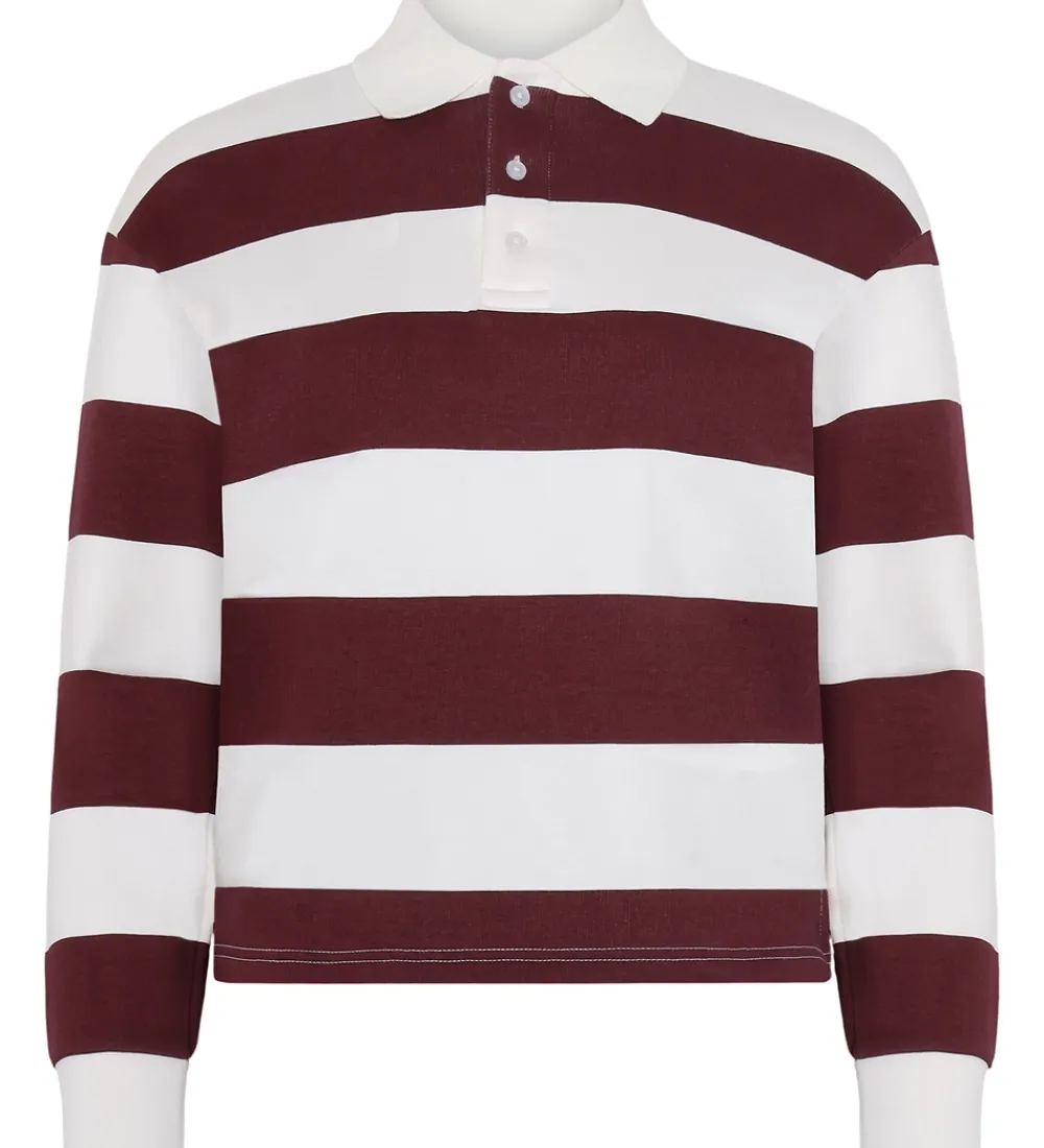 Smart Grunt polobluse i stribet mørkerød og hvid i lækker sweatkvalitet. Poloblusen har en klassisk krave og to knapper fortil. Den har lange ærmer med brede ribkanter, og i bunden er der en kort slids i begge sider. Indvendigt er der blødt, børstet bomuld.