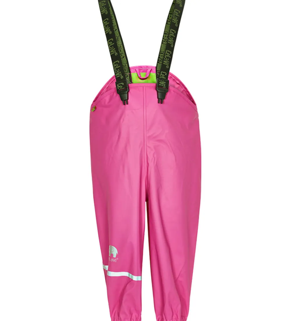 CeLaVi regnbukserne har brede, justerbare elastikseler, som åbnes fortil med klikspænder. I siderne kan regnbukserne justeres med en trykknap. Buksebenene har smalle elastikkanter, og der er justerbare elastikstropper til at sætte under gummistøvlerne.