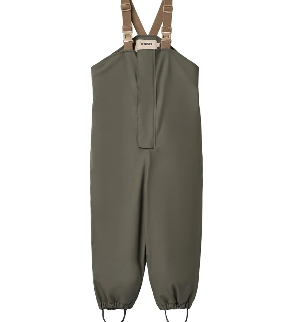 Wheat regnbukserne går langt op og dækker det meste af overkroppen og har elastiske seler, der kan justeres i længden og har klikspænder. Regnbukserne åbnes fortil ved hjælp af en lang lynlås med udvendig vindstolpe, der lukkes til med velcro. Buksebenene har elastikkanter om anklerne, og der er aftagelige, justerbare gummistropper til at sætte under fodtøjet.