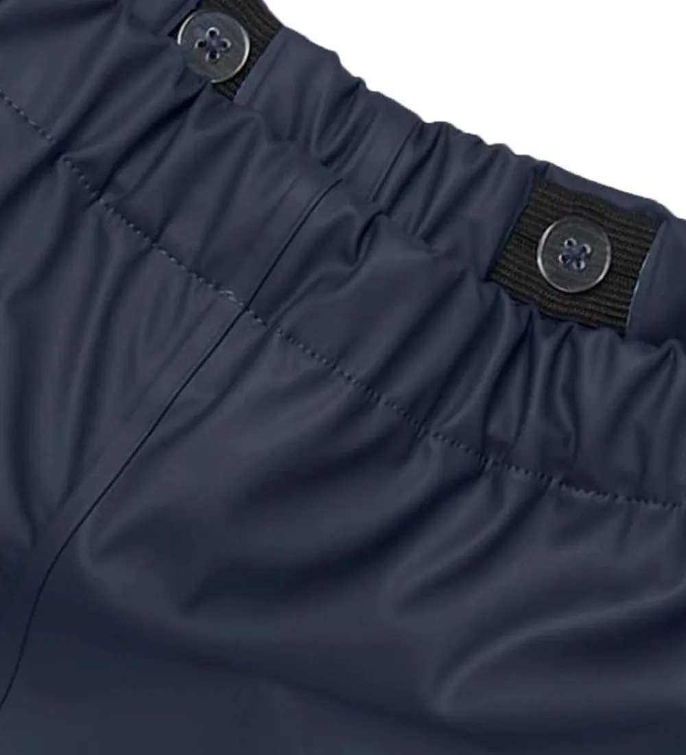 Name It regnbukserne har en indvendigt justerbar elastikkant i livet. Buksebenene har en elastikkant i bunden samt justerbare og aftagelige elastikstropper, som kan sættes under fodtøjet. Rundt om højre ærme og bukseben er der en refleks-stribe.
