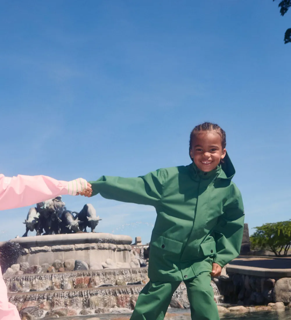 Flotte Molo regnbukser i ensfarvet gøn PE og med en praktisk logorefleks bag på højre ben.