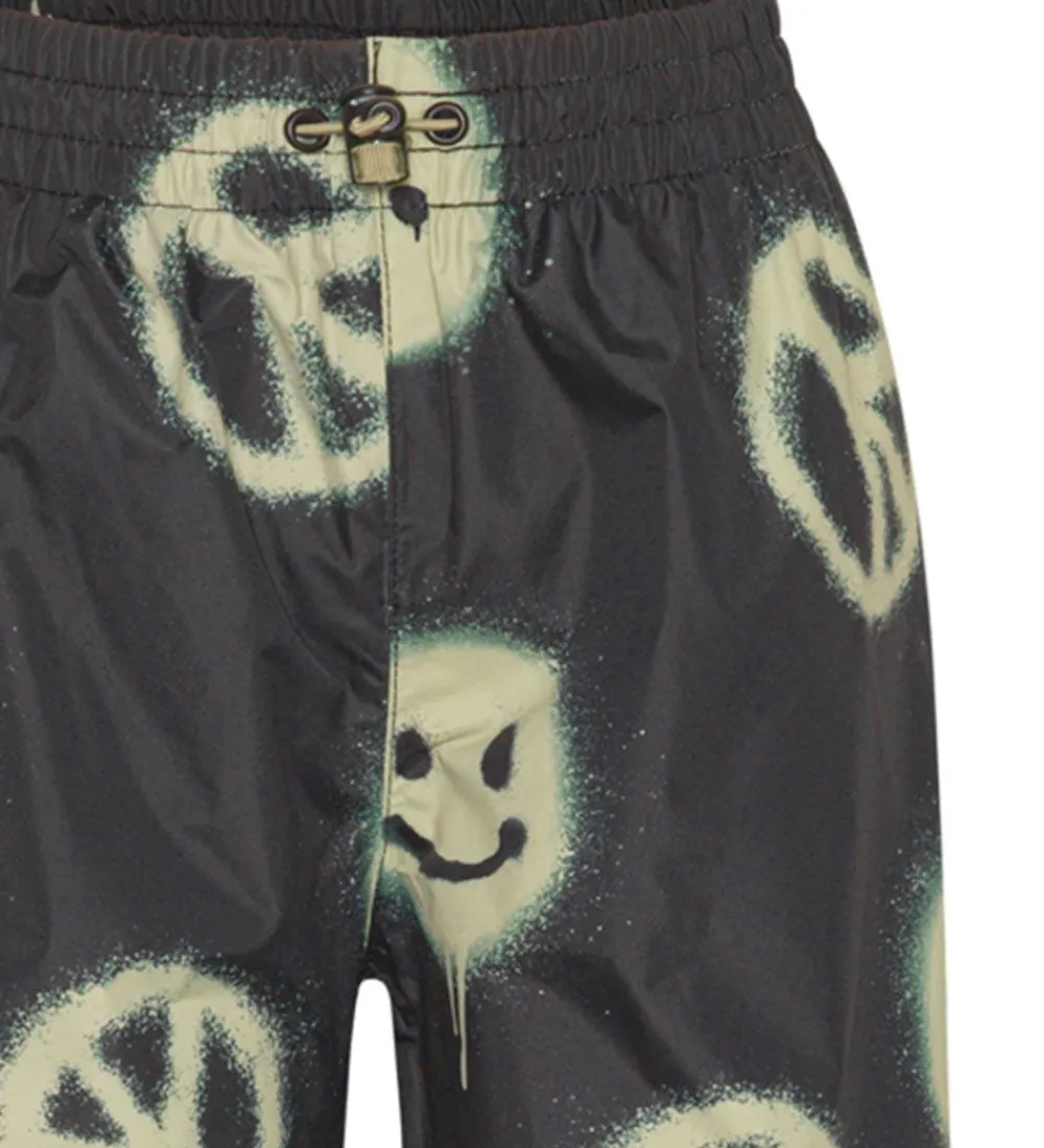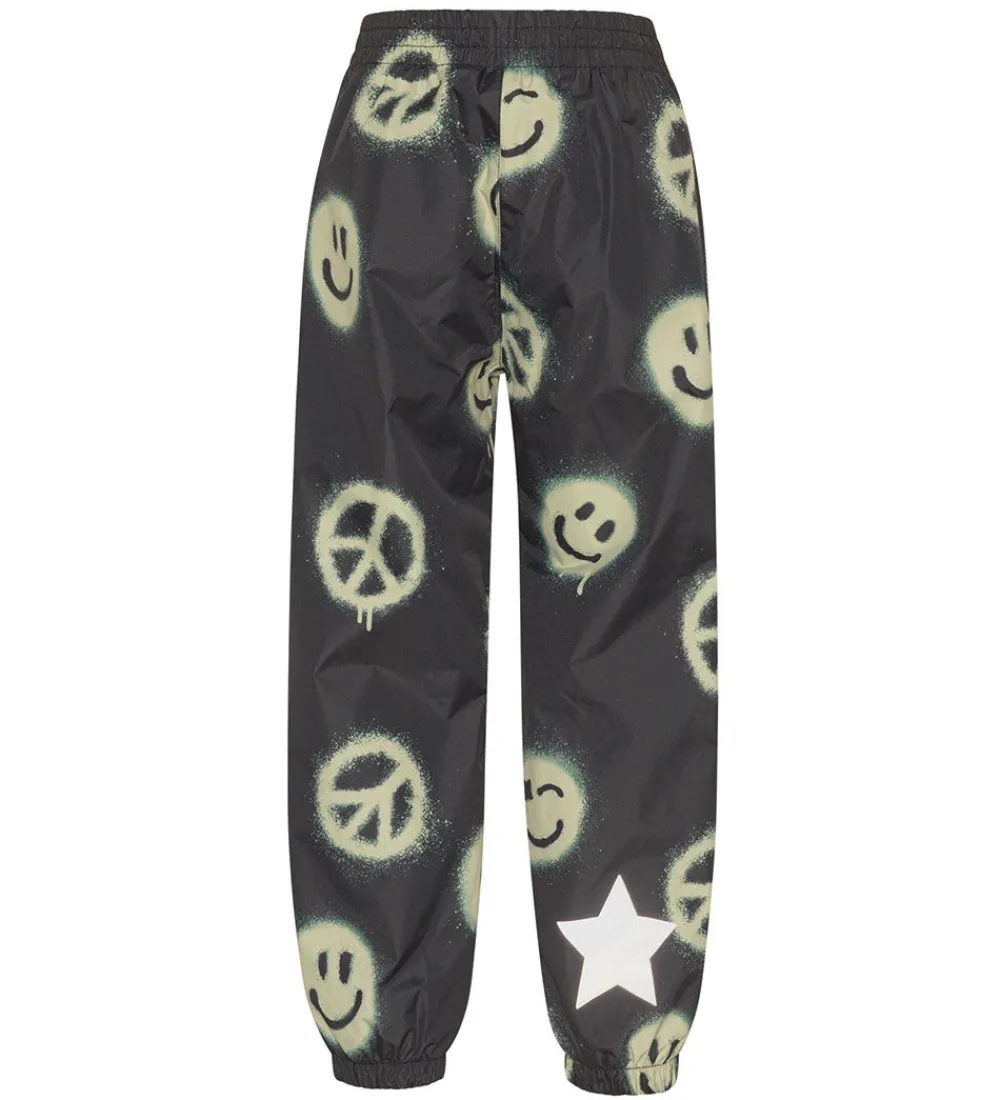 Seje Molo regnbukser i sort med et alloverprint af smileys i et beige grafitti-design. Regnbukserne er desuden udstyret med en stor, reflekterende Molo-stjerne bag på højre ben.