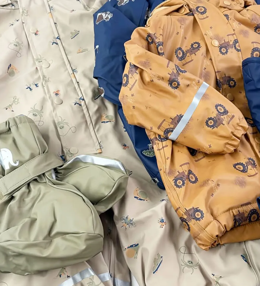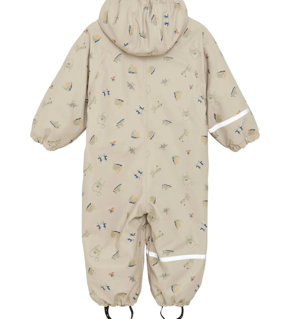 Flot CeLaVi regndragt i beige med alloverprint af forskellige seje insekter med en refleksstribe rundt om højre ærme og højre ben og et reflekslogo på venstre ærme og på hætten.