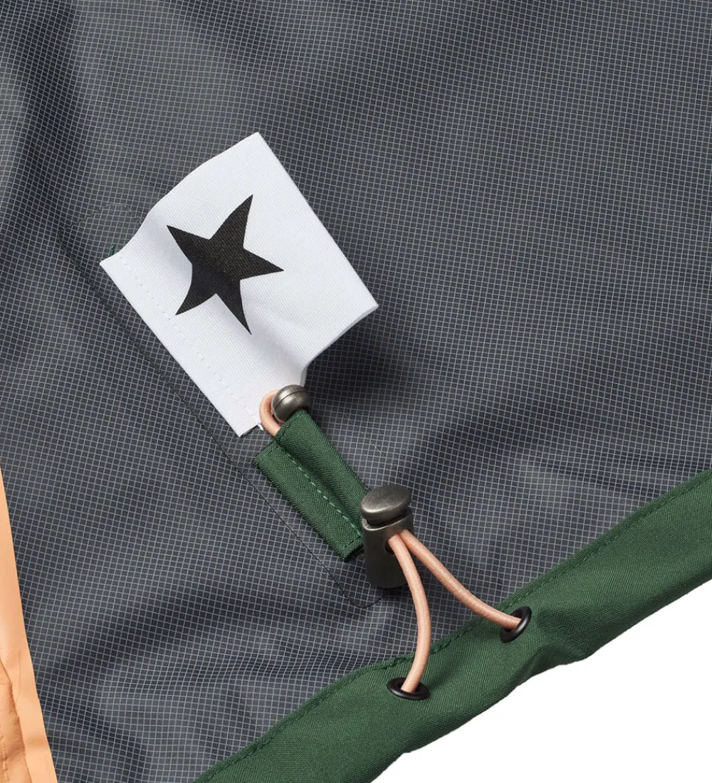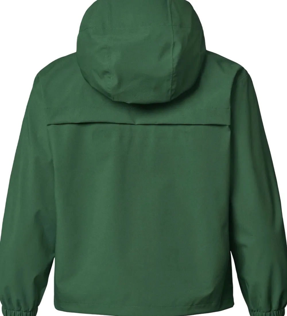 Fin Molo regnjakke af PE i grøn og med orange lynlås-vedhæng. På venstre bryst er der et logorefleksprint, og indvendigt er der orange detaljer i form stropper og tapede sømme.