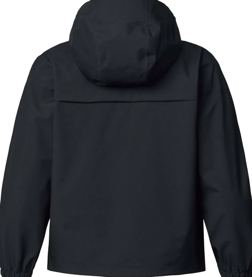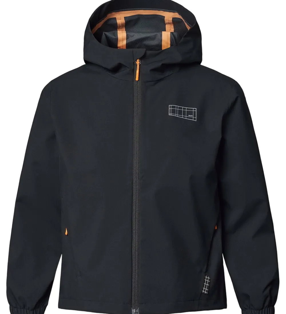 Fin Molo regnjakke af PE i sort og med orange lynlås-vedhæng. På venstre bryst er der et logorefleksprint, og indvendigt er der orange detaljer i form stropper og tapede sømme.