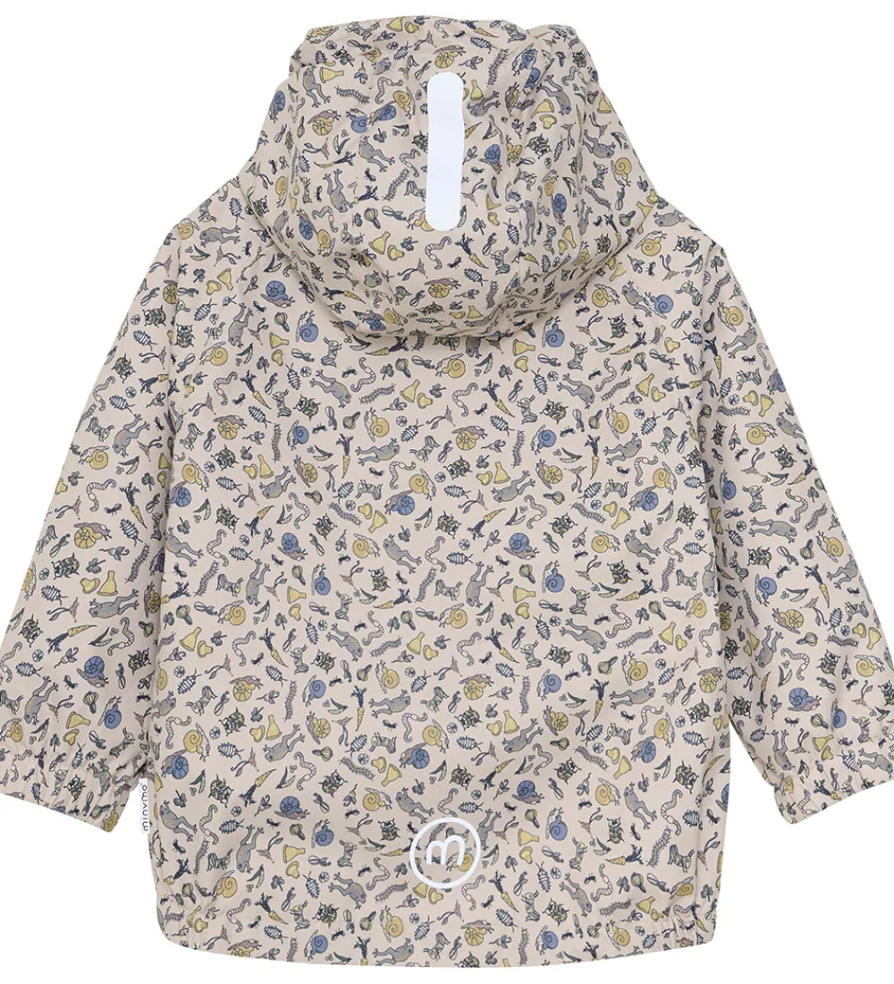 Sej Minymo regnjakke i en varm, grå nuance med alloverprint af smådyr og planter i grønne, blå og gule nuancer. Regnjakken er i en lækker PE-kvalitet.